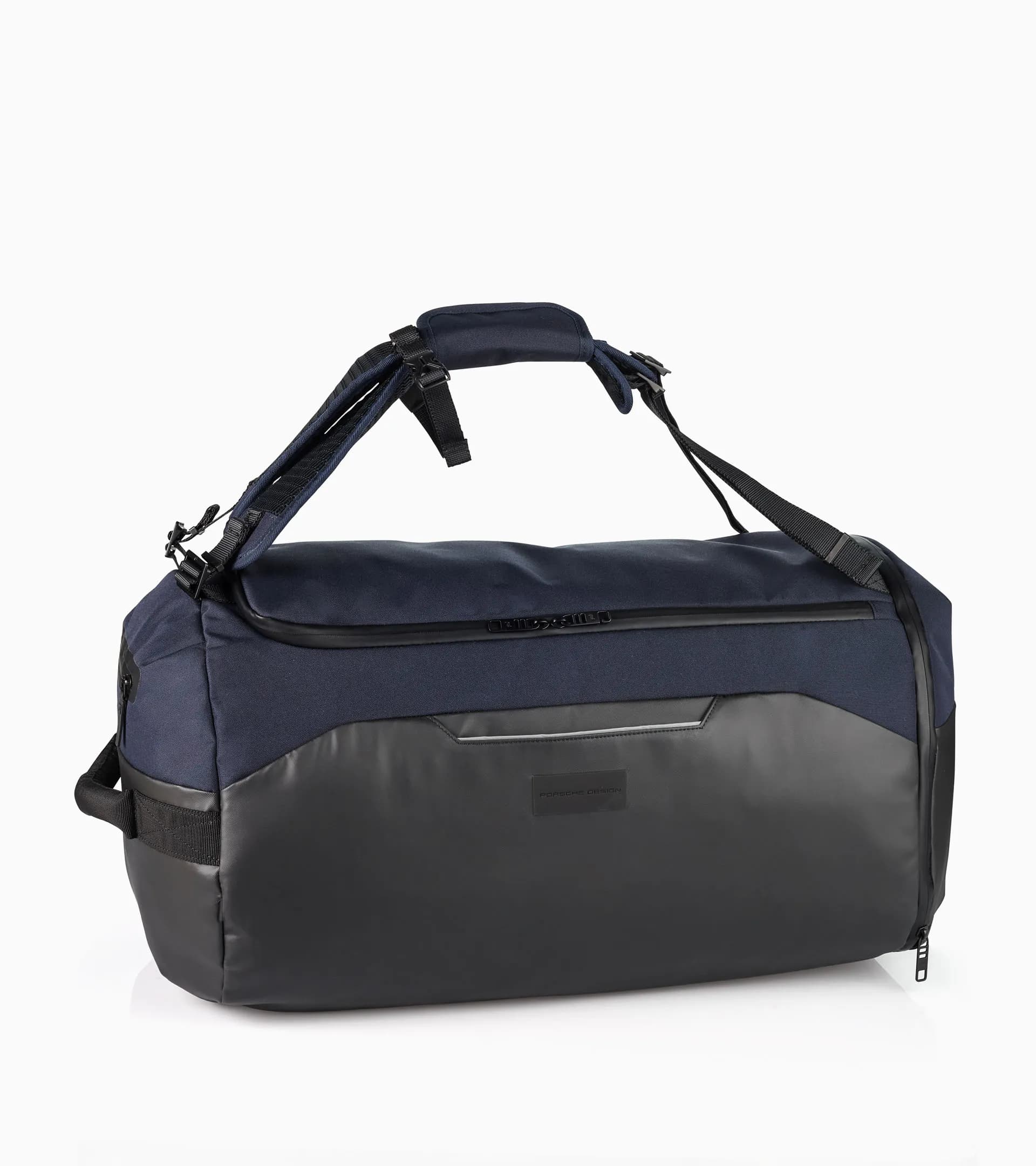 A fusion of smart style and sustainability, functionality and flexibility: the Porsche Design Urban Eco Collection doesn't really fit into any specific category, but it does fit perfectly into modern everyday life. The water-repellent duffle bag made of recycled polyester fabric and polyurethane is particularly abrasion-resistant and weatherproof. A spacious main compartment with a two-way zip offers enough space for every trip. Two slide-in compartments and various zip compartments ensure order and quick access to all important essentials. A specially designed shoe compartment and an additional side compartment with interchangeable zip pulls expand the storage options. The bag can be carried casually by hand or worn comfortably as a backpack with padded shoulder straps and chest strap. Reflective details on the front and a slide-in compartment underneath combine design and functionality. The Porsche Design branding on the back as well as uniquely designed decorative elements and fittings complete the stylish look of the bag.