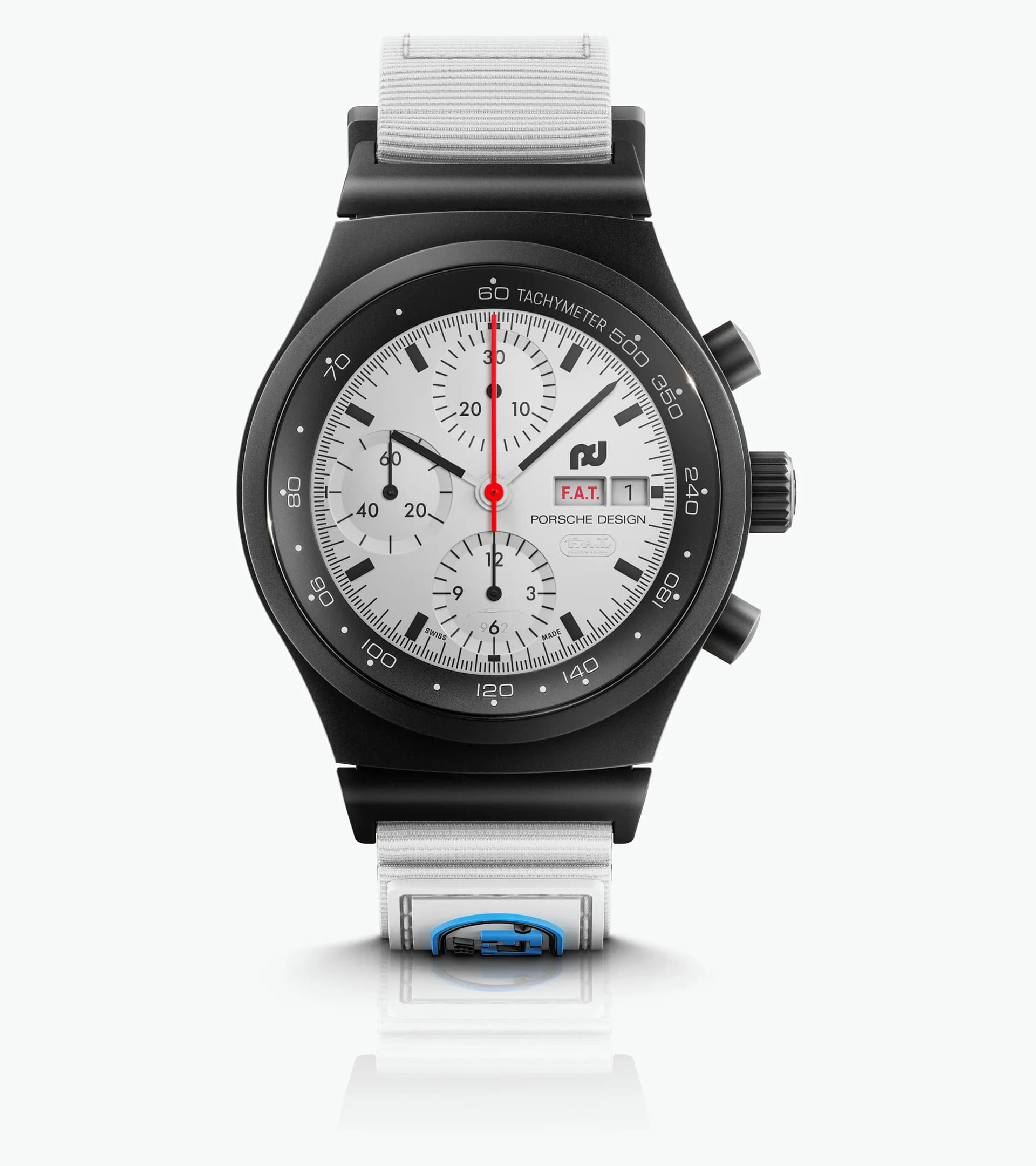 The Porsche Design Chronograph 1 – F.A.T. 2025 Edition. The first Chronograph 1 with a white, fully luminescent dial. Developed in close collaboration with the motorsport community F.A.T. International. Made for motorsport enthusiasts and racing drivers.