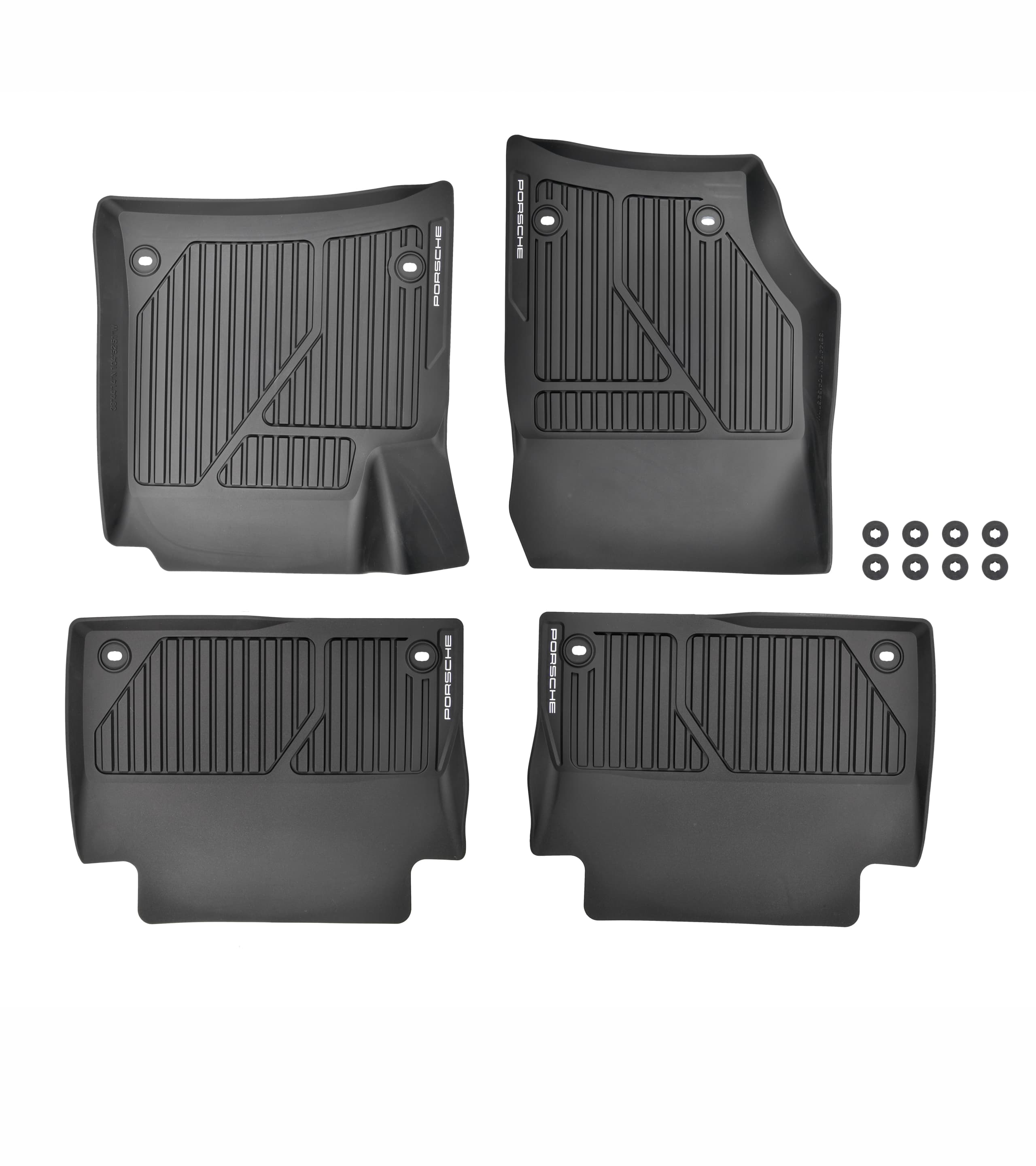Redo för alla typer av äventyr. Det fyrdelade setet med slitstarka offroad-mattor skyddar fotutrymmet i Cayenne E1 och ger det ett exklusivt utseende. De smutsavvisande mattorna har en elegant design och vit ”PORSCHE”-logotyp. De är exakt anpassade efter fotutrymmets konturer i Cayenne E1. Passar vänsterstyrda fordon.