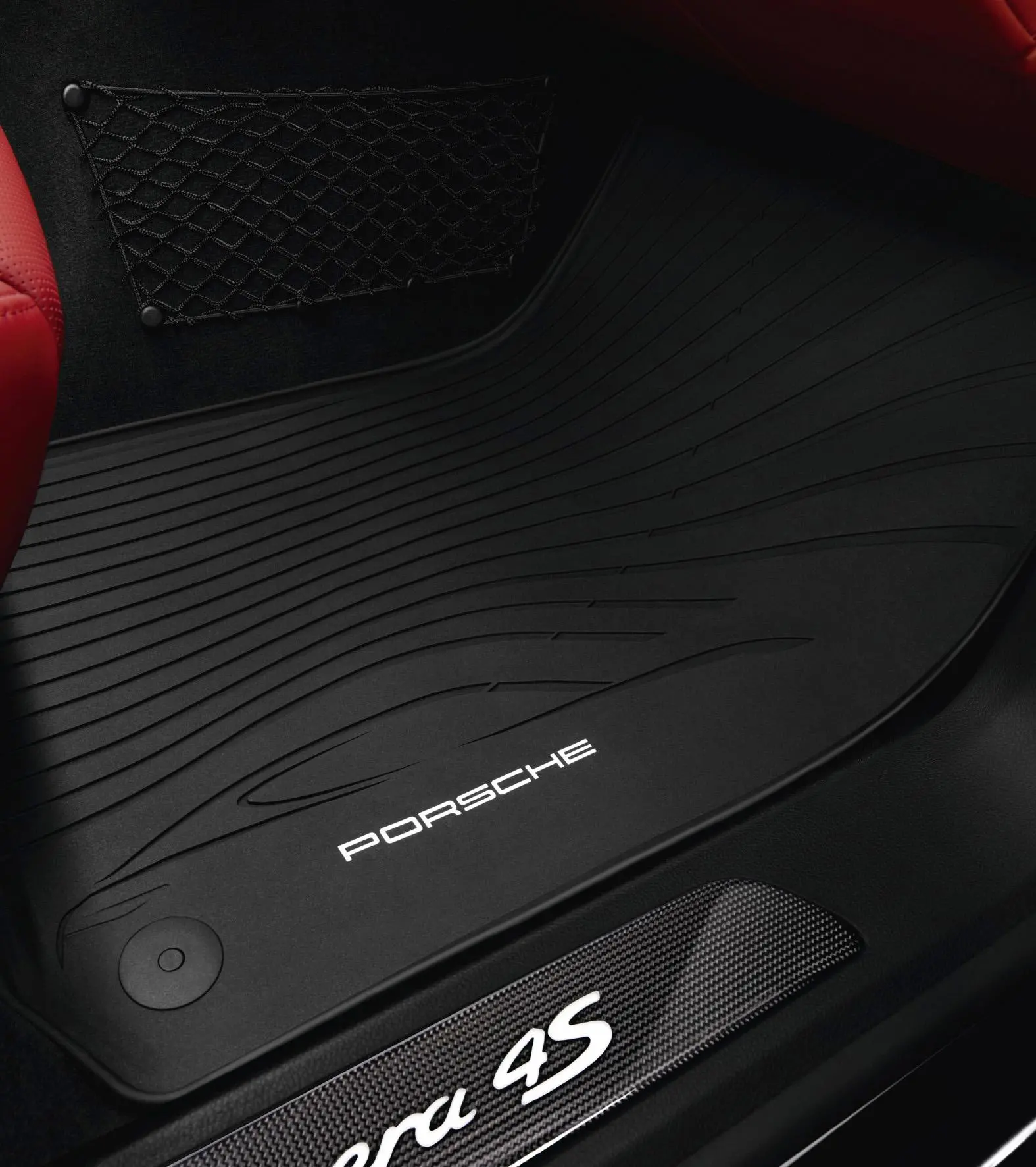 Fyrdelat set i snygg design med fordonssiluett och ”PORSCHE”-text. Halkfri och vattentät med upphöjd kant.