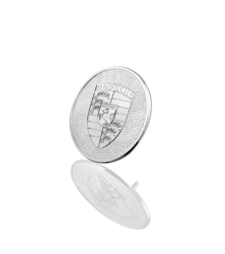Plakett med Porsche-emblem för centrumkåpor. Mattförkromad.