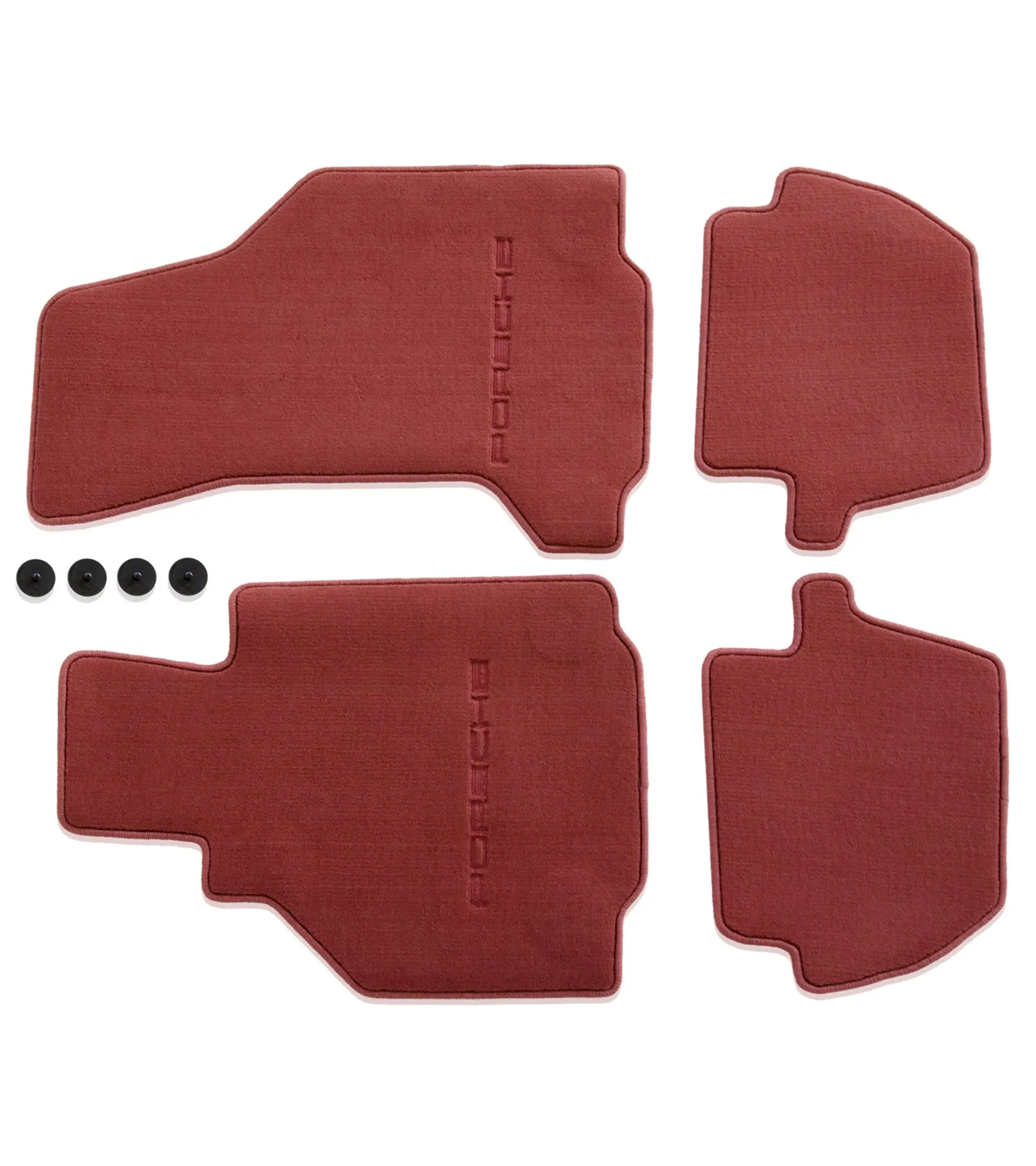 Set med golvmattor (4 delar) i boxsterrött för vänsterstyrda fordon. Kan användas i Porsche 996 Cabrio och Targa, årsmodell 2002 till 2005 – till årsmodell 01 (digitalt ljudpaket) och från årsmodell 02 (Bose analogt ljudpaket).