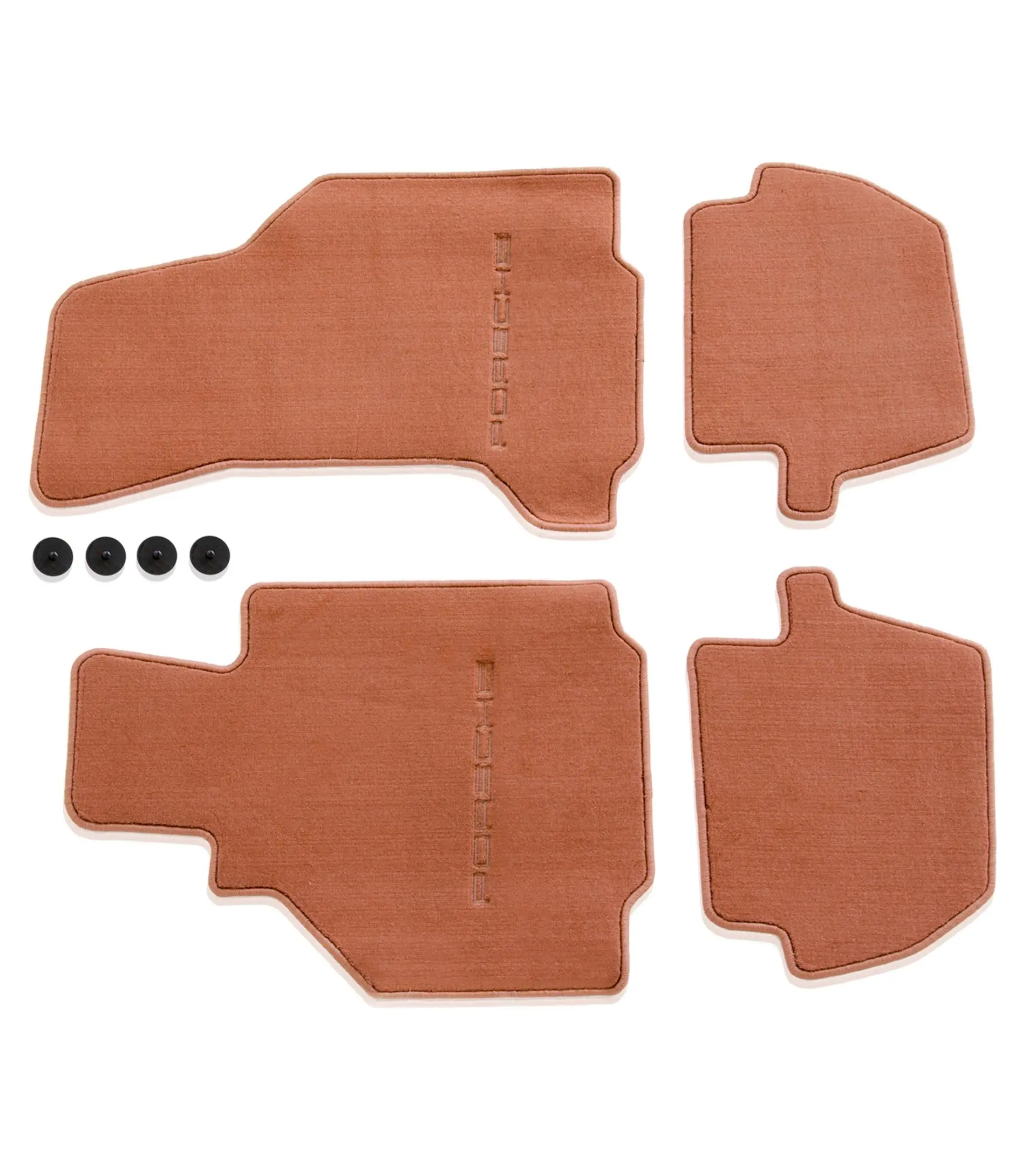 Set med golvmattor (4 delar) i kanelbrunt för vänsterstyrda fordon. Kan användas i Porsche 996 Cabrio och Targa, årsmodell 2002 till 2005 – till årsmodell 01 (digitalt ljudpaket) och från årsmodell 02 (Bose analogt ljudpaket).