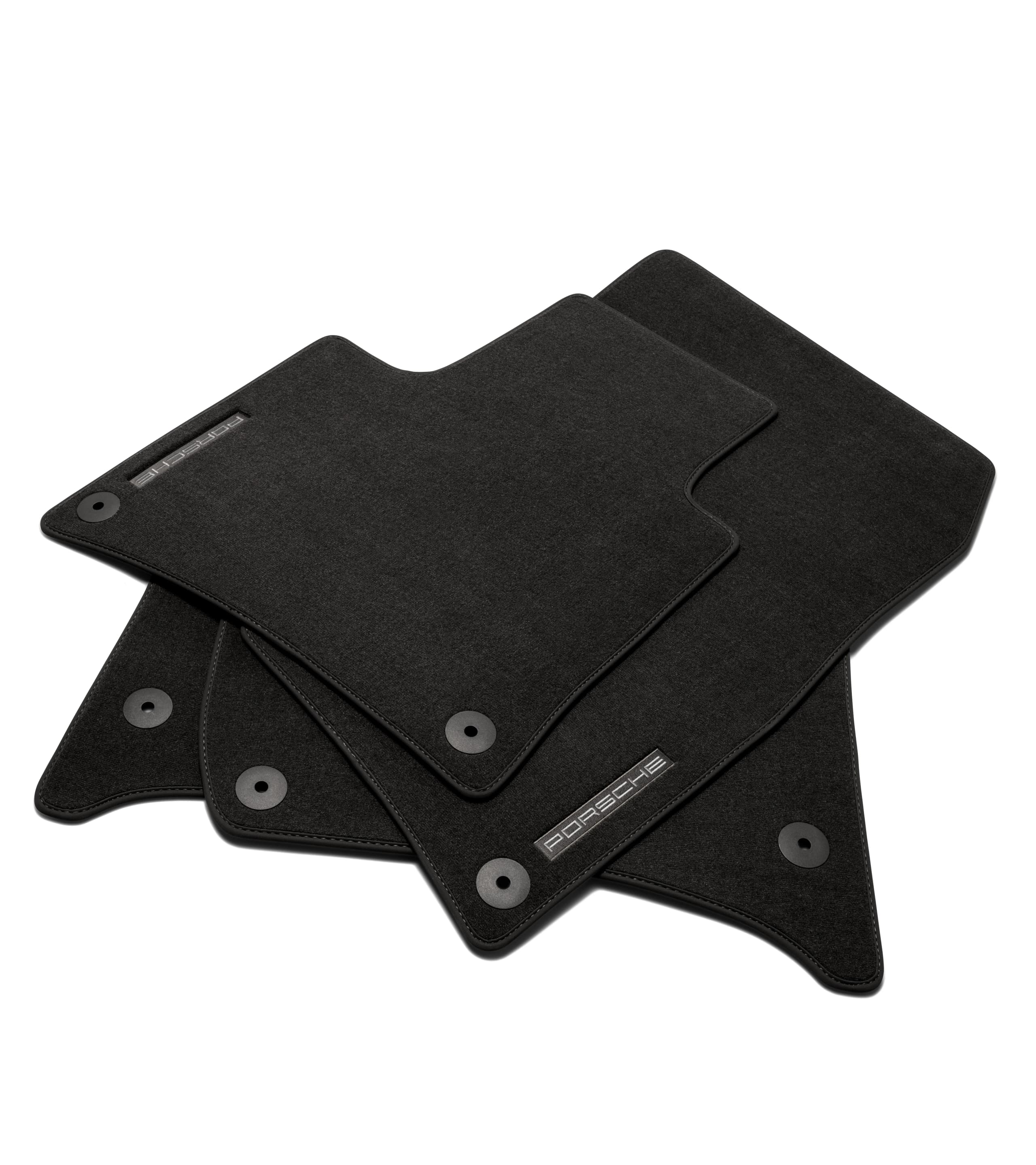 Fyrdelat set, i utvalda interiörfärger, med nubuckkant och inlägg med broderad ”PORSCHE”-text i silver.
