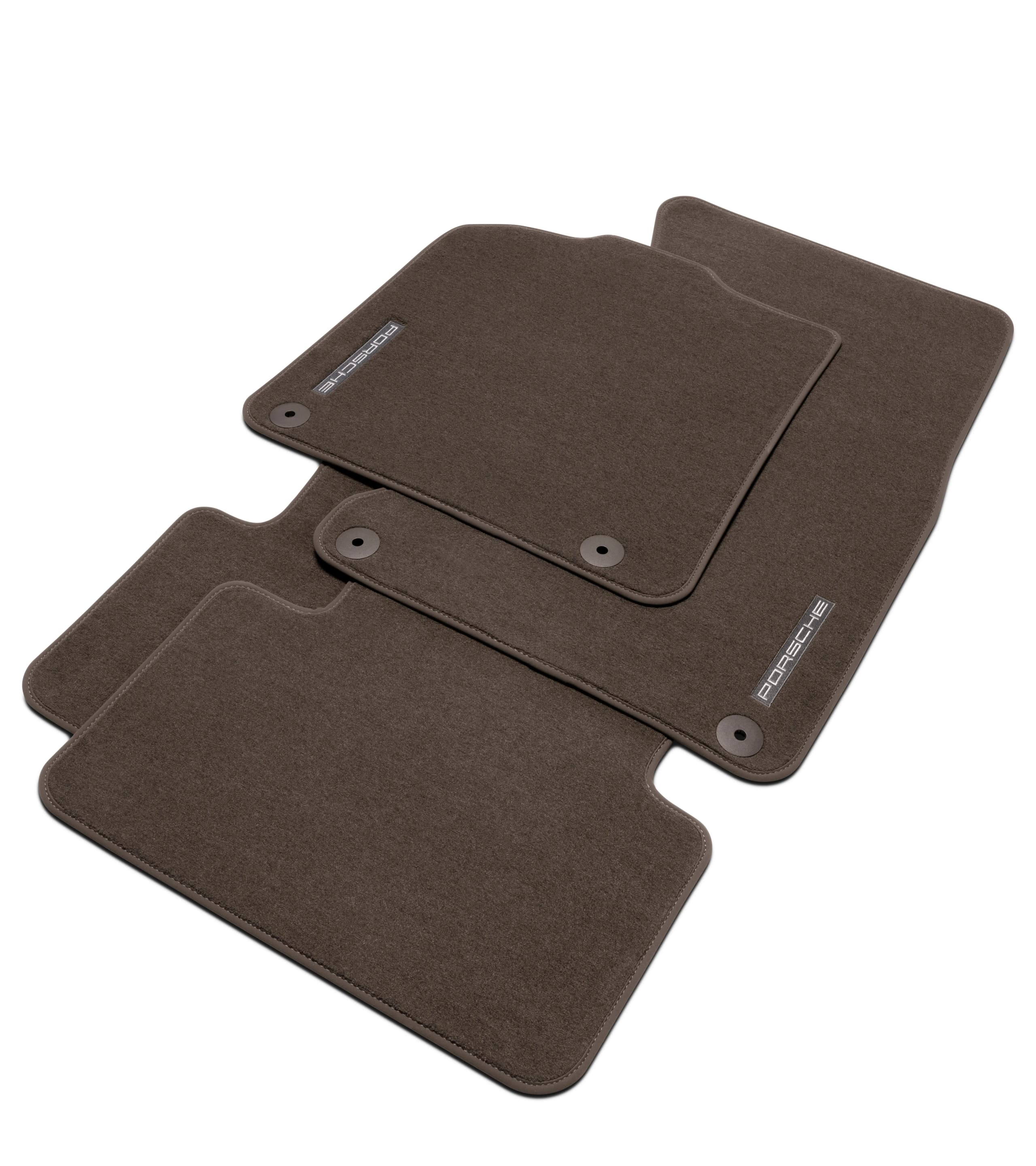 Fyrdelat set, i utvalda interiörfärger, med nubuckkant och inlägg med broderad ”PORSCHE”-text i silver.