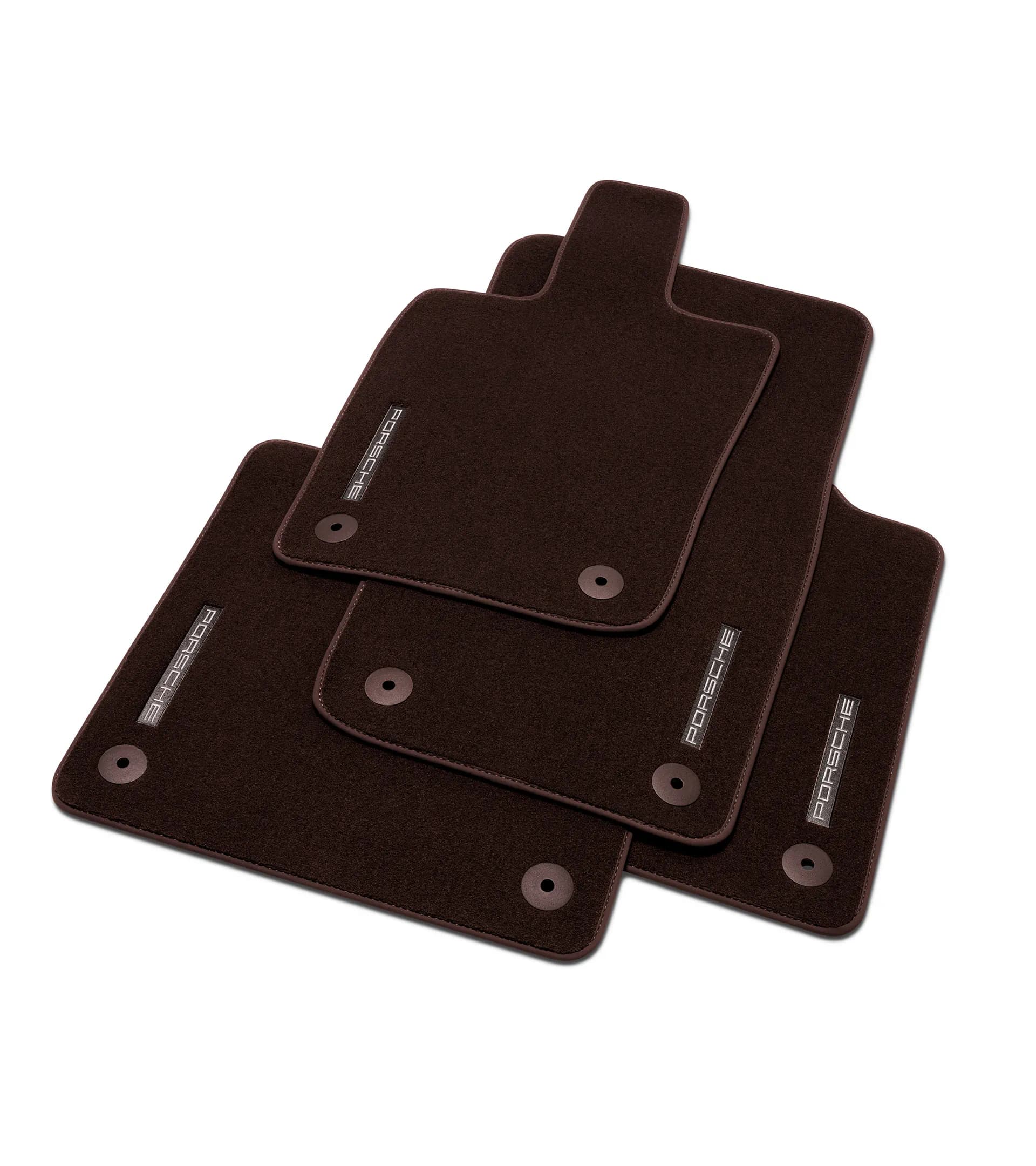 Fyrdelat set, i utvalda interiörfärger, med nubuckkant och inlägg med broderad ”PORSCHE”-text i silver.