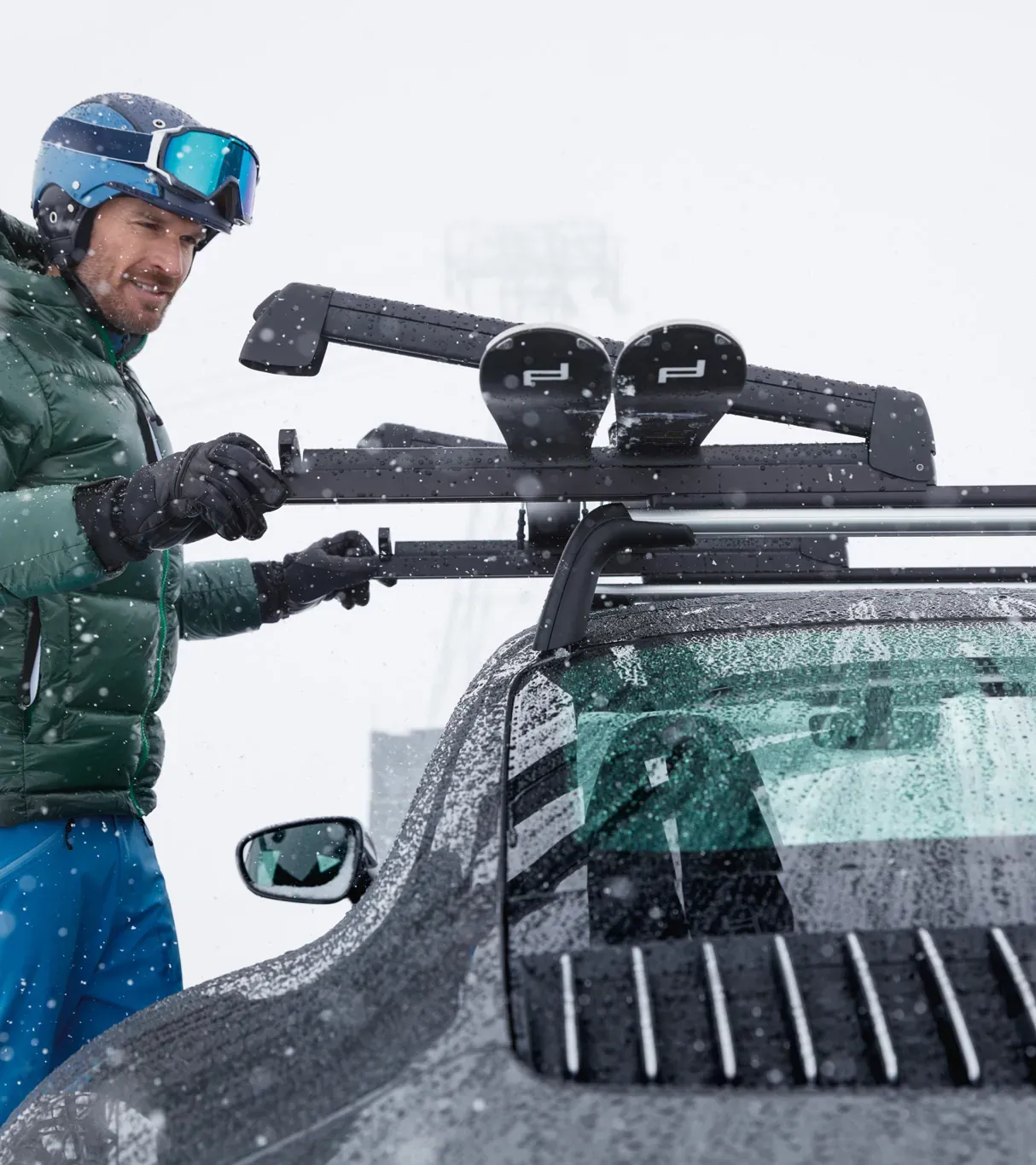 Skid- och snowboardhållare med ”PORSCHE”-text för säker transport av upp till 5 par skidor eller 2 snowboard.