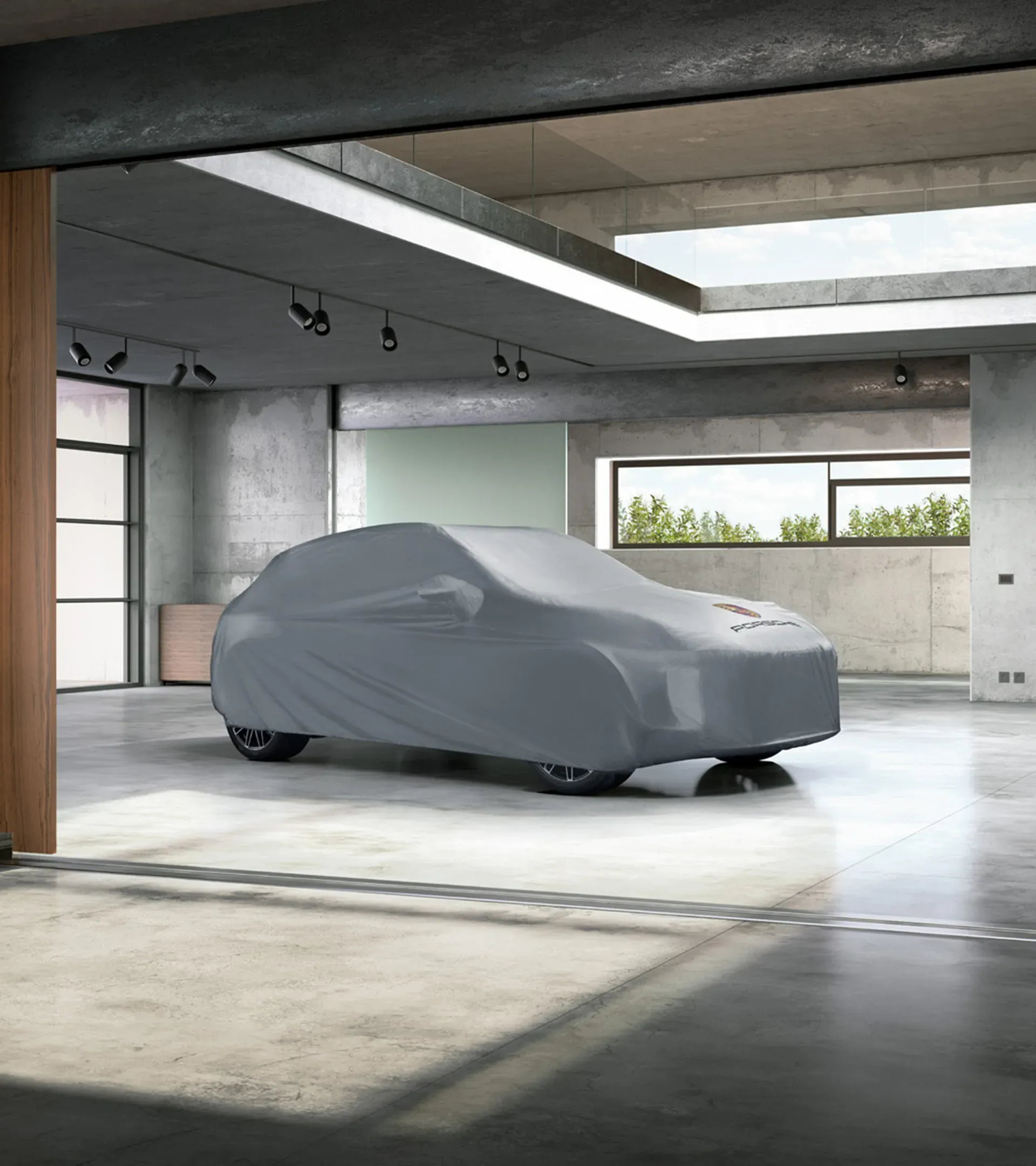 Custom-fit outdoor vehicle cover made of water-repellent material with a coloured Porsche Crest and „PORSCHE“ logo. Including anti-theft protection.