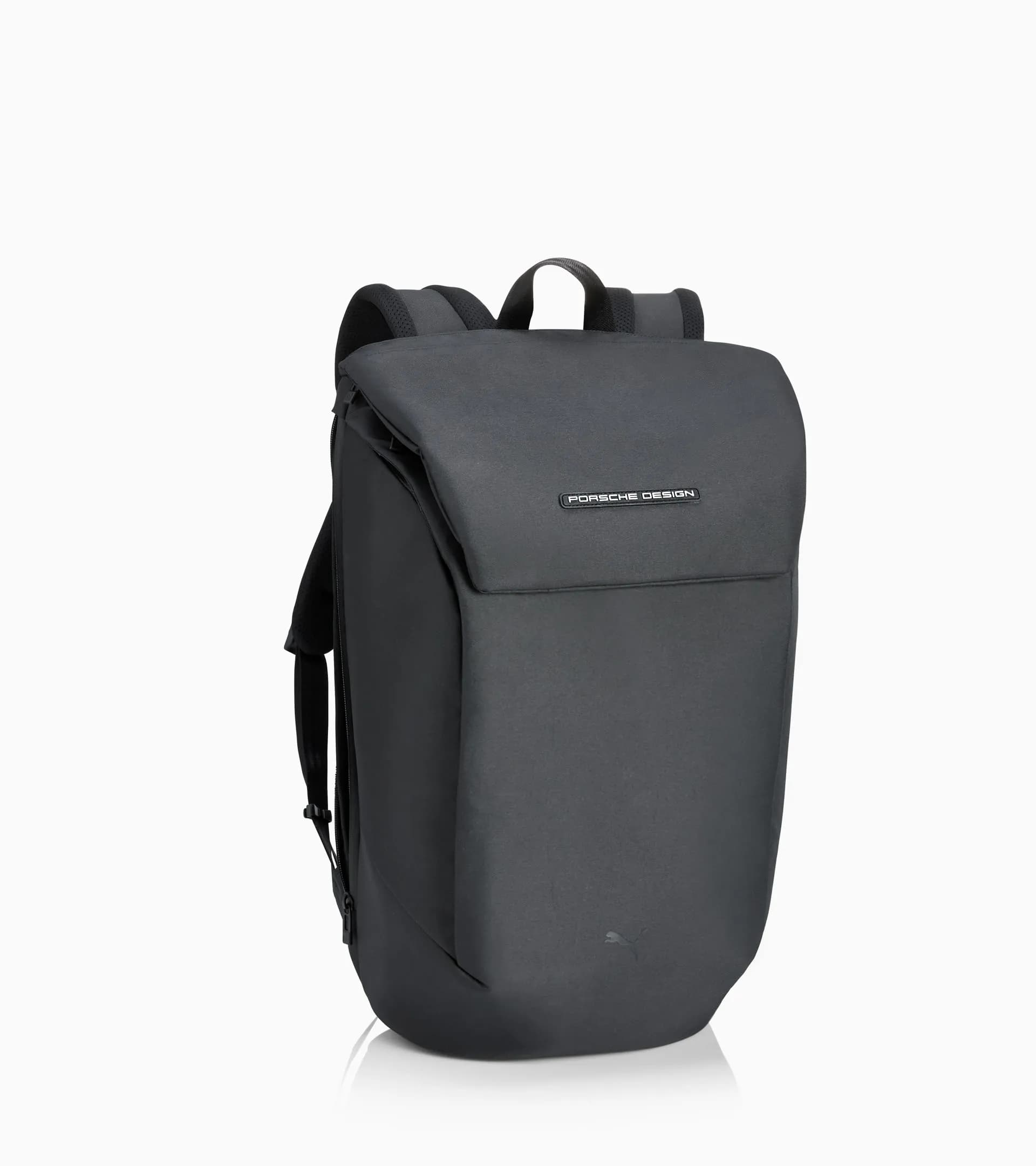 Backpack made from recycled material.External compartment for laptops up to 15" in size.Flap construction with fleece pocket.High-quality silicone Porsche Design logo.Internal layout perfect for organising items.Padded back.Side pocket with organisational layout.Zipped and magnetic flap.