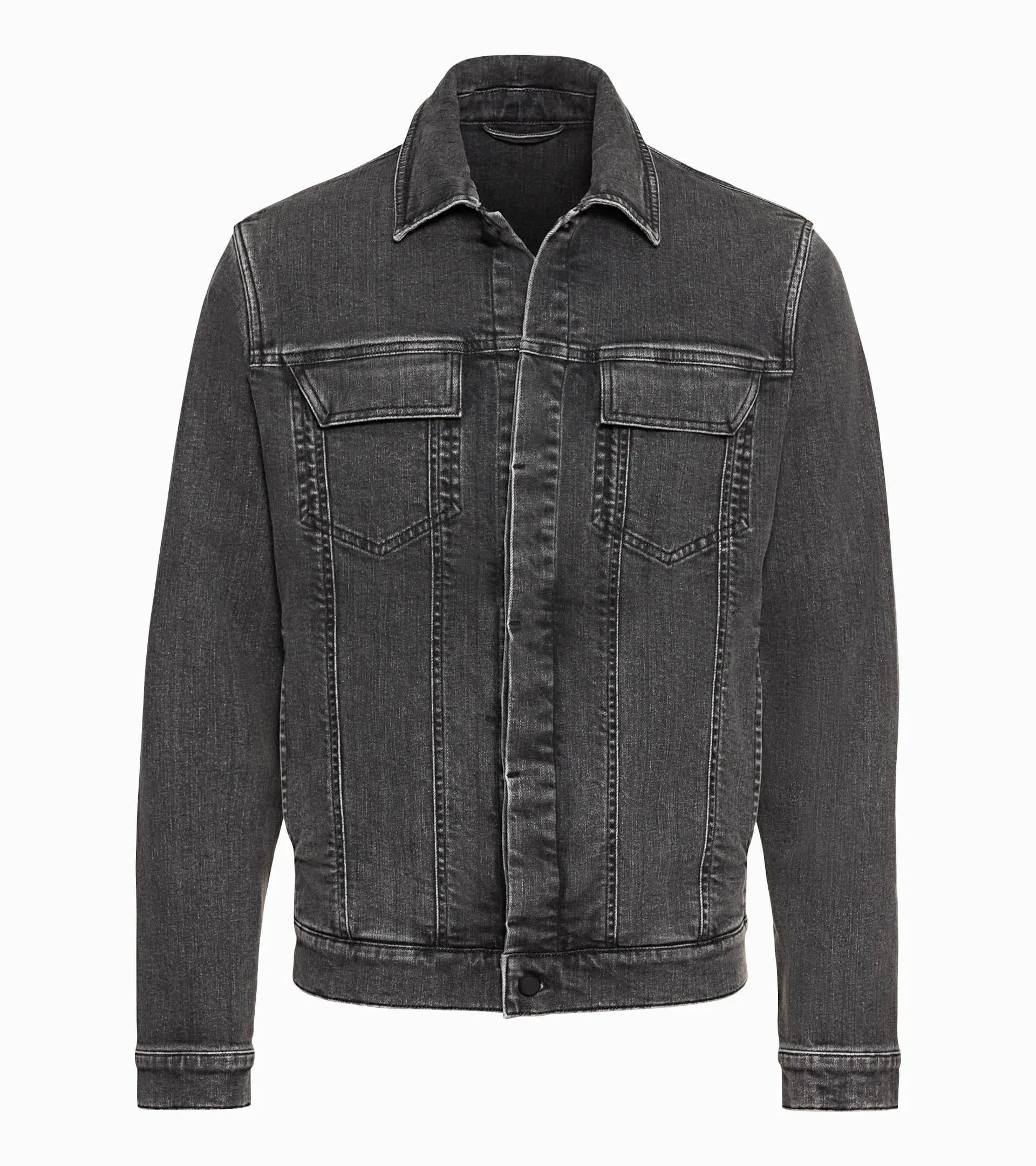 Men's designer jacket made from high-quality stretch denim with a large logo. The men's gray denim jacket in a modern design features exclusive Porsche Design 3D embossing.