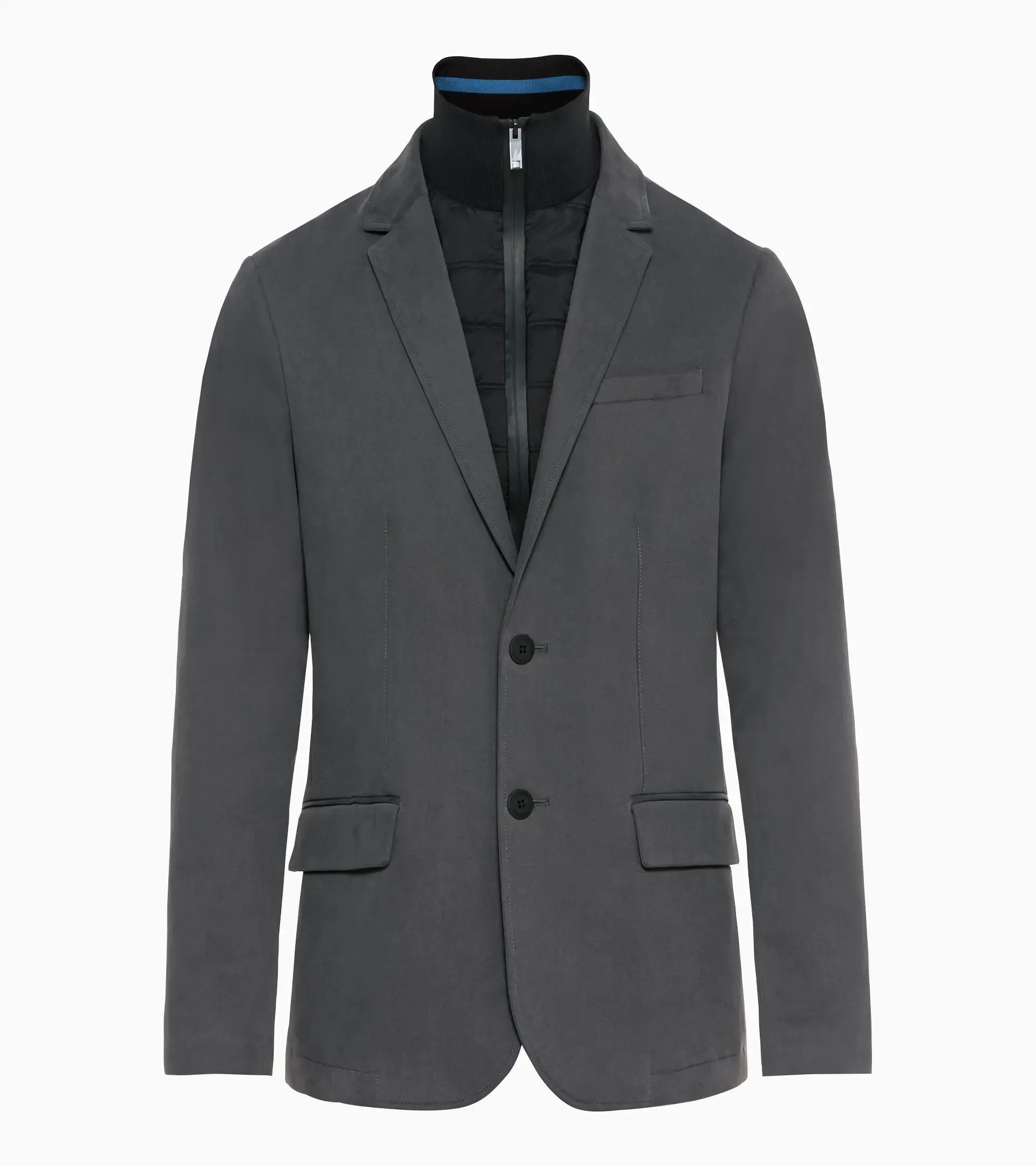 A hybrid for maximum performance – on the road and in business. Even when worn on its own, the perfect shape of the Porsche Design Modern Hybrid Blazer with a quilted stand-up collar inlay is impressive thanks to the elastic cotton fabric with a soft feel and the perfect cut with a two-button closure, kissing buttons and a slit on the back. Combined with the clean quilted insert with taped Porsche Design zipper, the blazer becomes an exciting design statement – and the stand-up collar also replaces a scarf. The knitted inner collar with Bright Blue contrasting stripes, the collar stand made of lamb nappa with Porsche Design embossing, the custom-made Porsche Design buttons and a PD icon patch on the sleeve ensure extra exclusivity and dynamism.