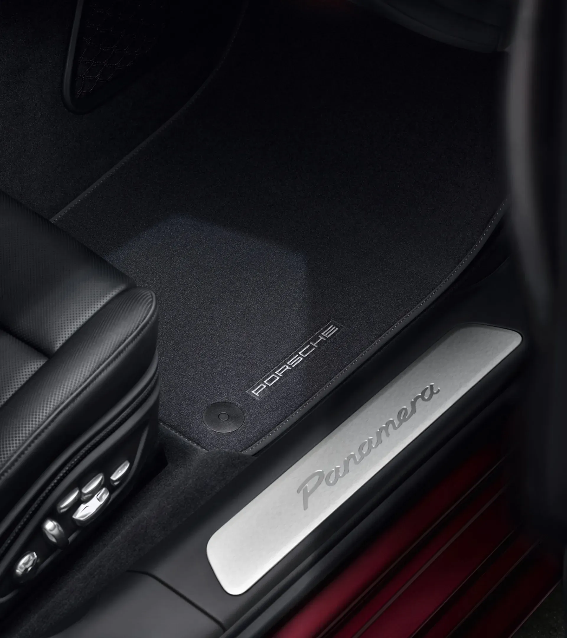 Enhance your Panamera’s interior with these premium black floor mats, featuring high-quality nubuk leather trim and a silver "PORSCHE" logo. Designed for vehicles with rear fastening points, this set of four is available in selected interior colors and is compatible with Panamera (G1) and Panamera (G1 II) models.