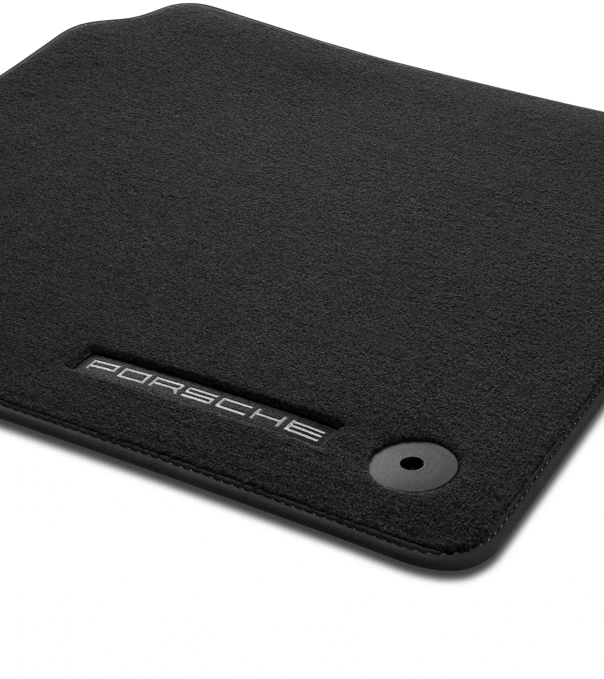 Enhance your Panamera's interior with this set of black floor mats featuring high-quality nubuk leather trim and silver "PORSCHE" logo stitching; tailored for the Executive variant of the Panamera.