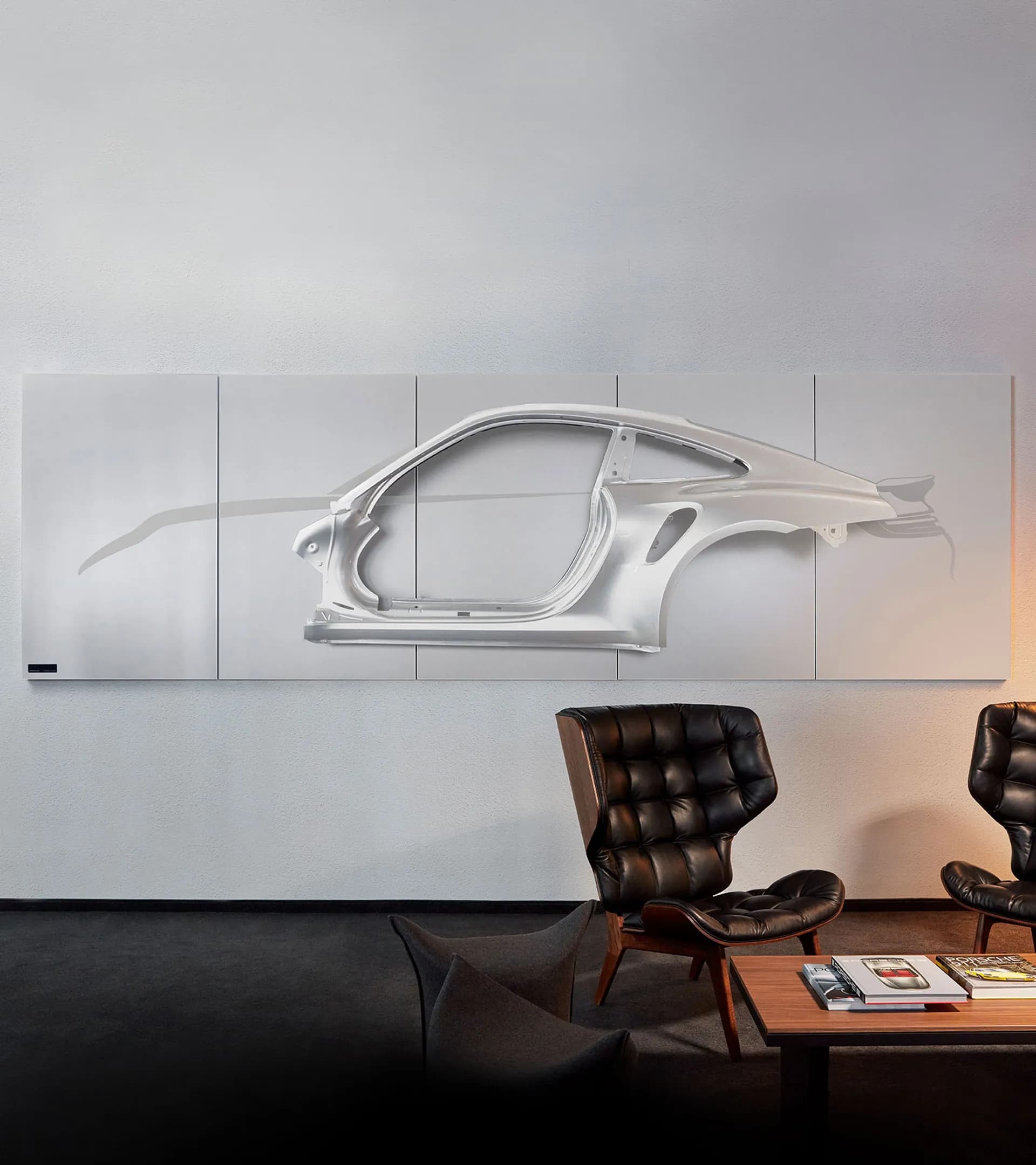 Bringing the fascination of Porsche to your home: limited-edition, customisable wall installation, consisting of an original chassis part from the Porsche 911 Turbo [992]. Silhouette of the 911 Turbo [992] reproduced in high-quality foil on the entire rear panel. Side section