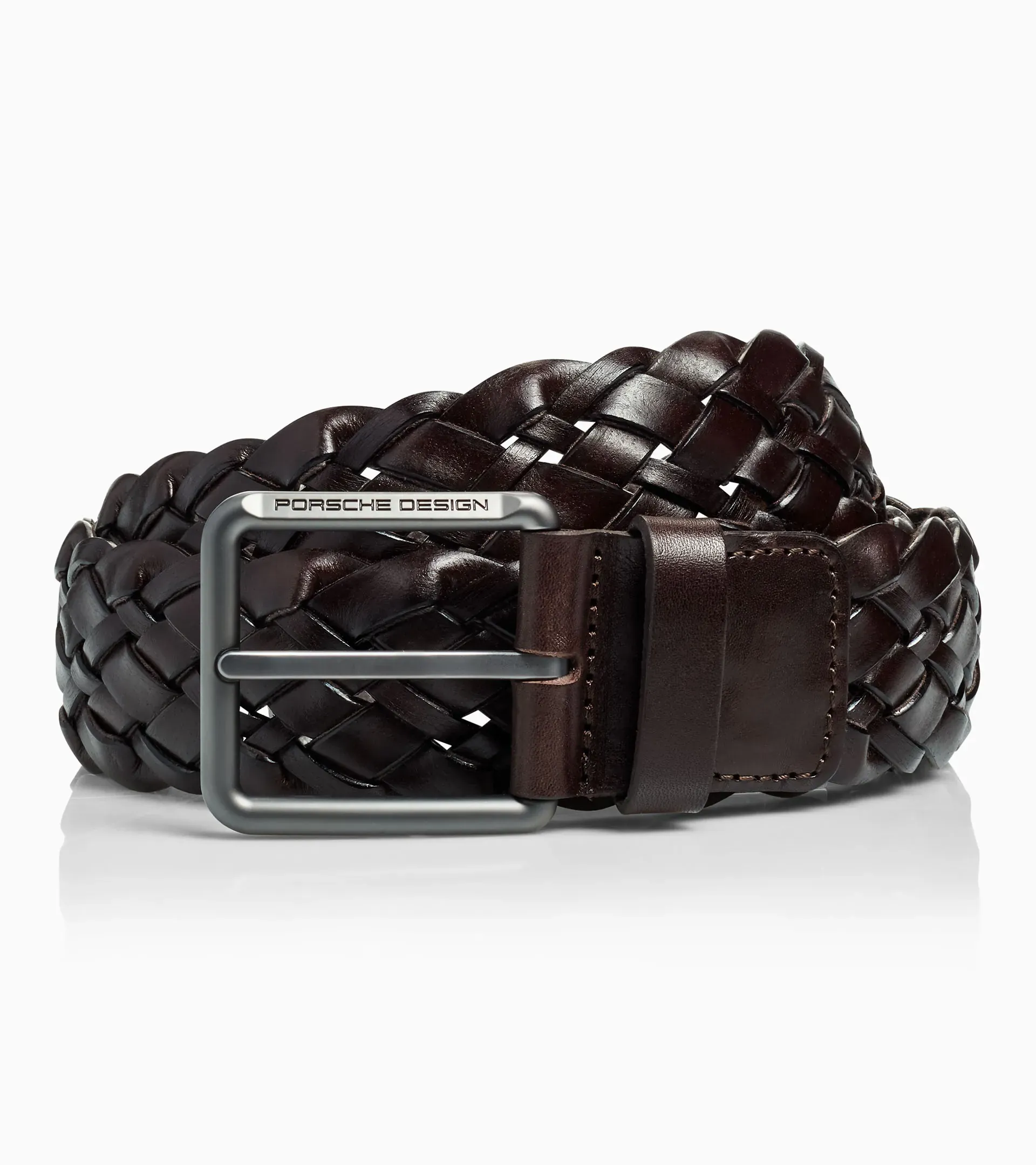 Braided Porsche Design leather belt for casual looks with an exclusive buckle in a matt titanium look.