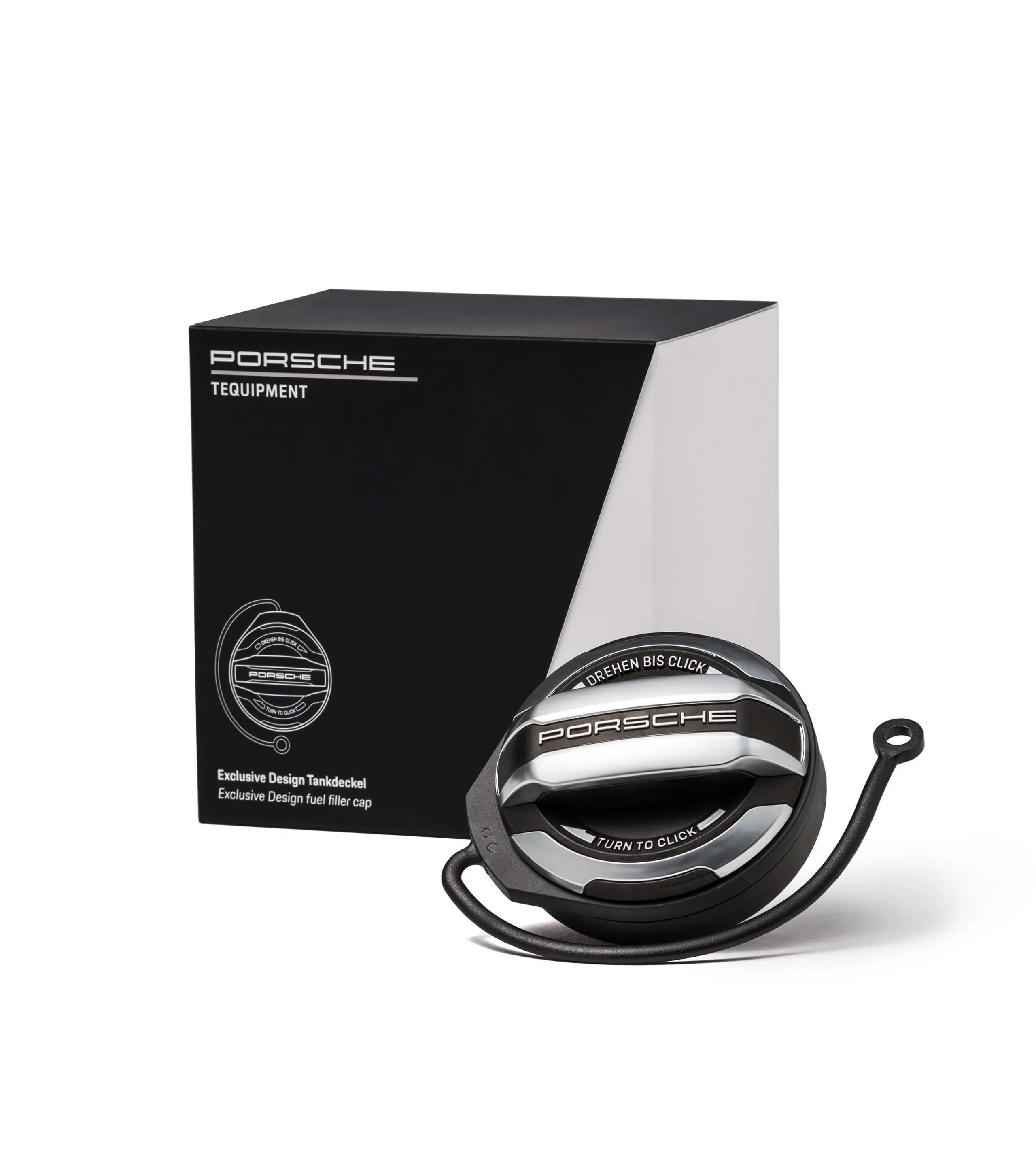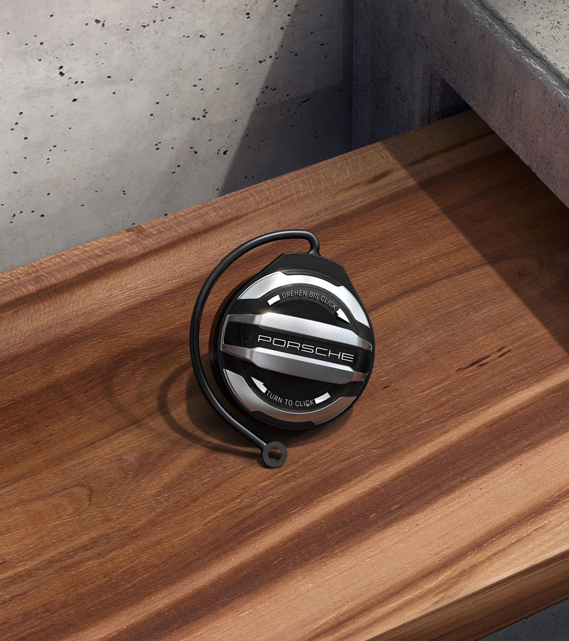The Porsche Exclusive Design Tank Cap features high-quality design elements with the "PORSCHE" logo in aluminum look, including a tether for loss prevention. Available for the following models: