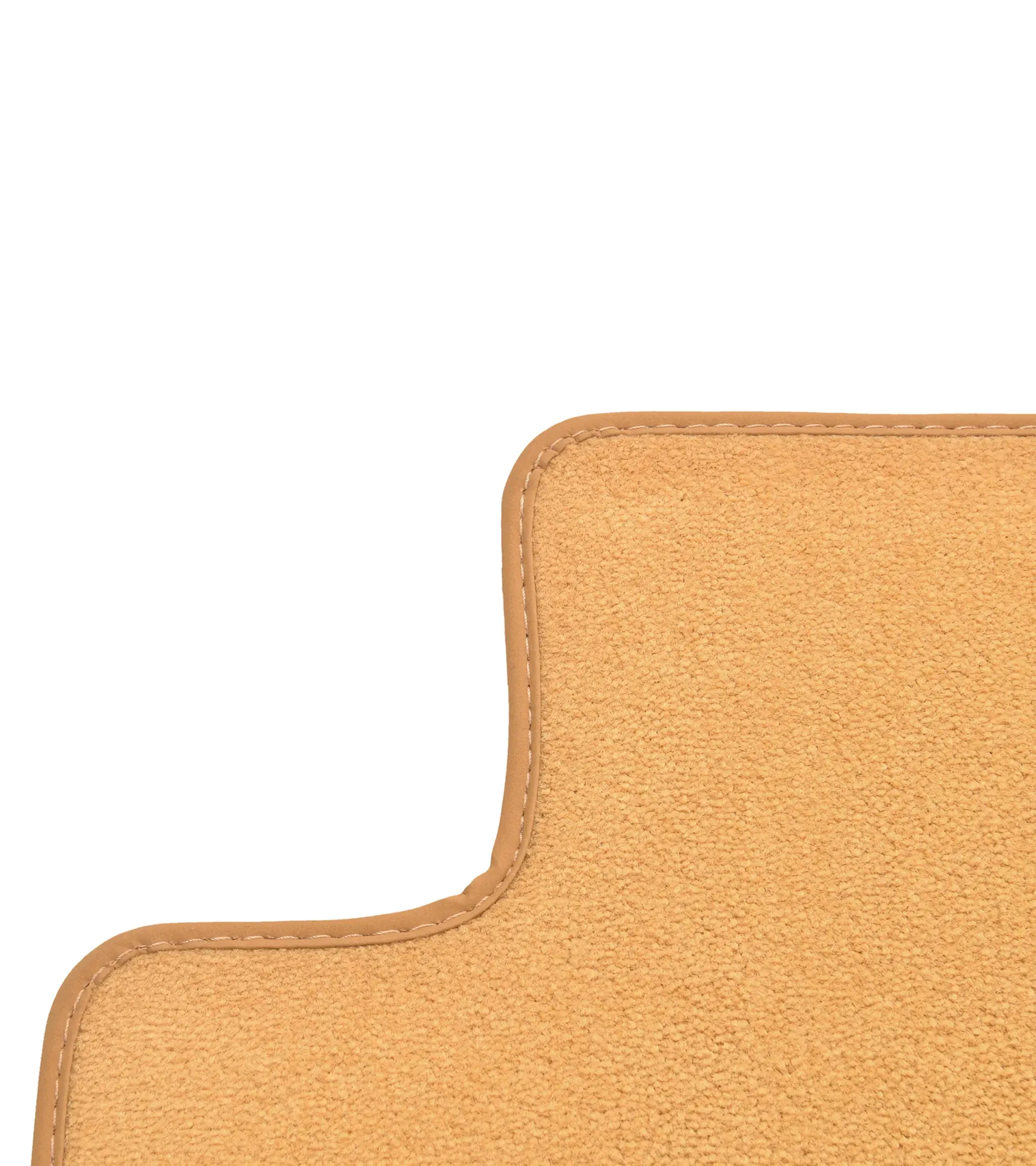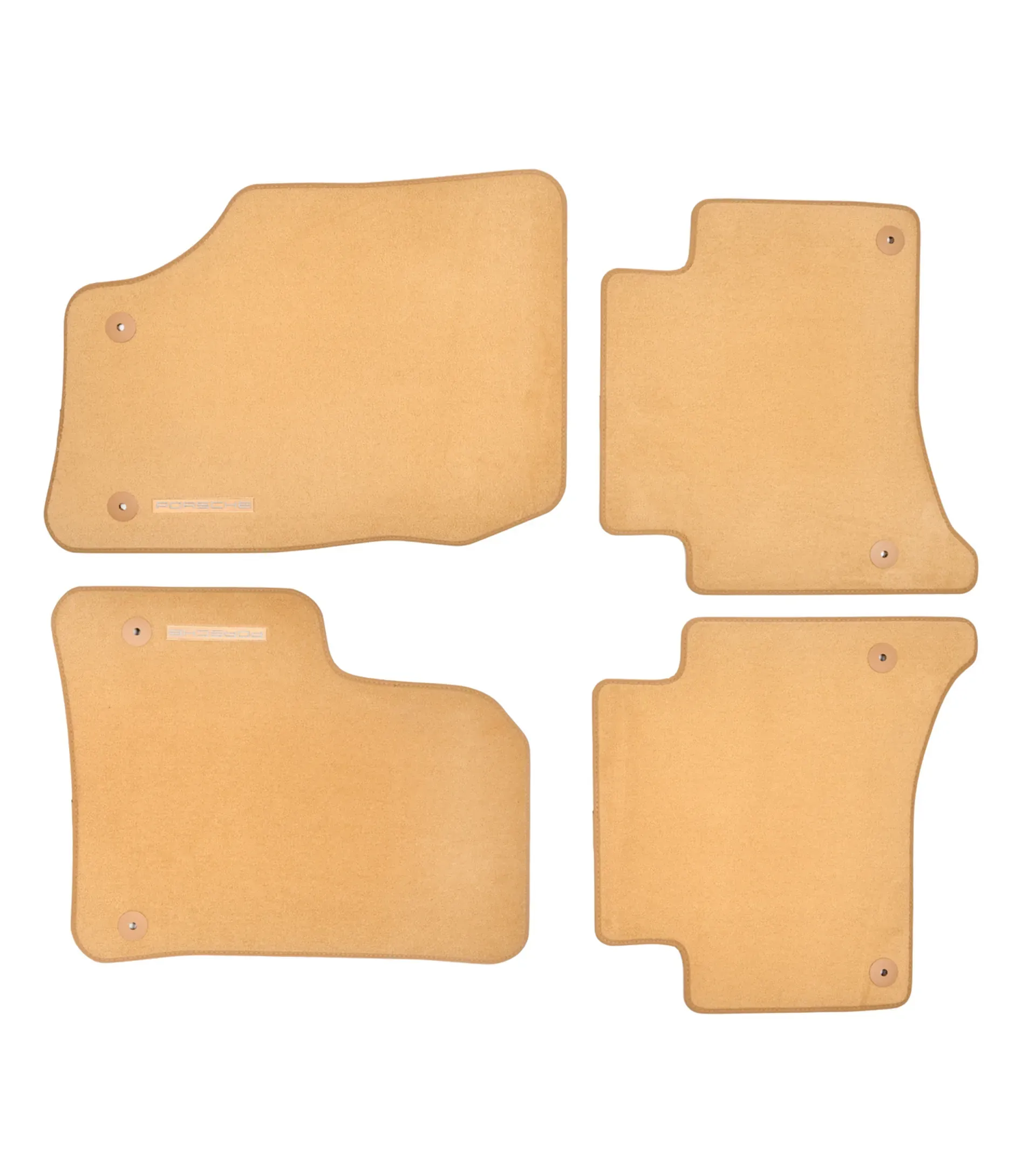 Enhance your Porsche Cayenne (E1) with this set of 4 Sand Beige floor mats, designed for left-hand-drive models from 2003 to 2010. These high-quality mats feature nubuk edging and a silver embroidered "PORSCHE" logo. For a secure fit, please order the corresponding fastening set for vehicles with a rotary-toggle lock.