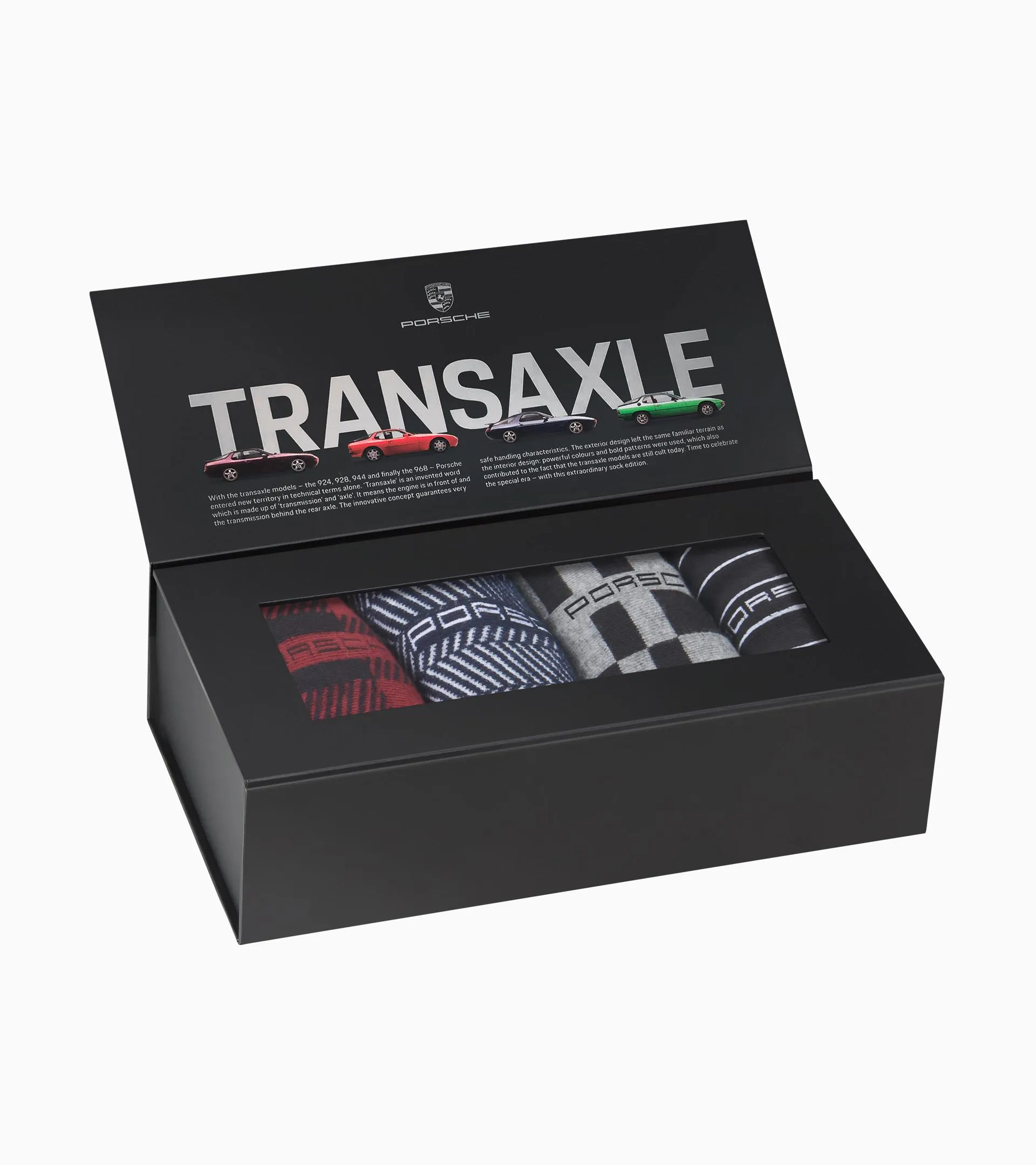 Porsche socks box with four similar pairs of socks, inspired by the interior of the Porsche transaxle models 924, 928, 944 and 968: pinstripe, tartan, Pascha and herringbone. Vein-friendly sensitive cuff. Pressure-free hand-linked tip.