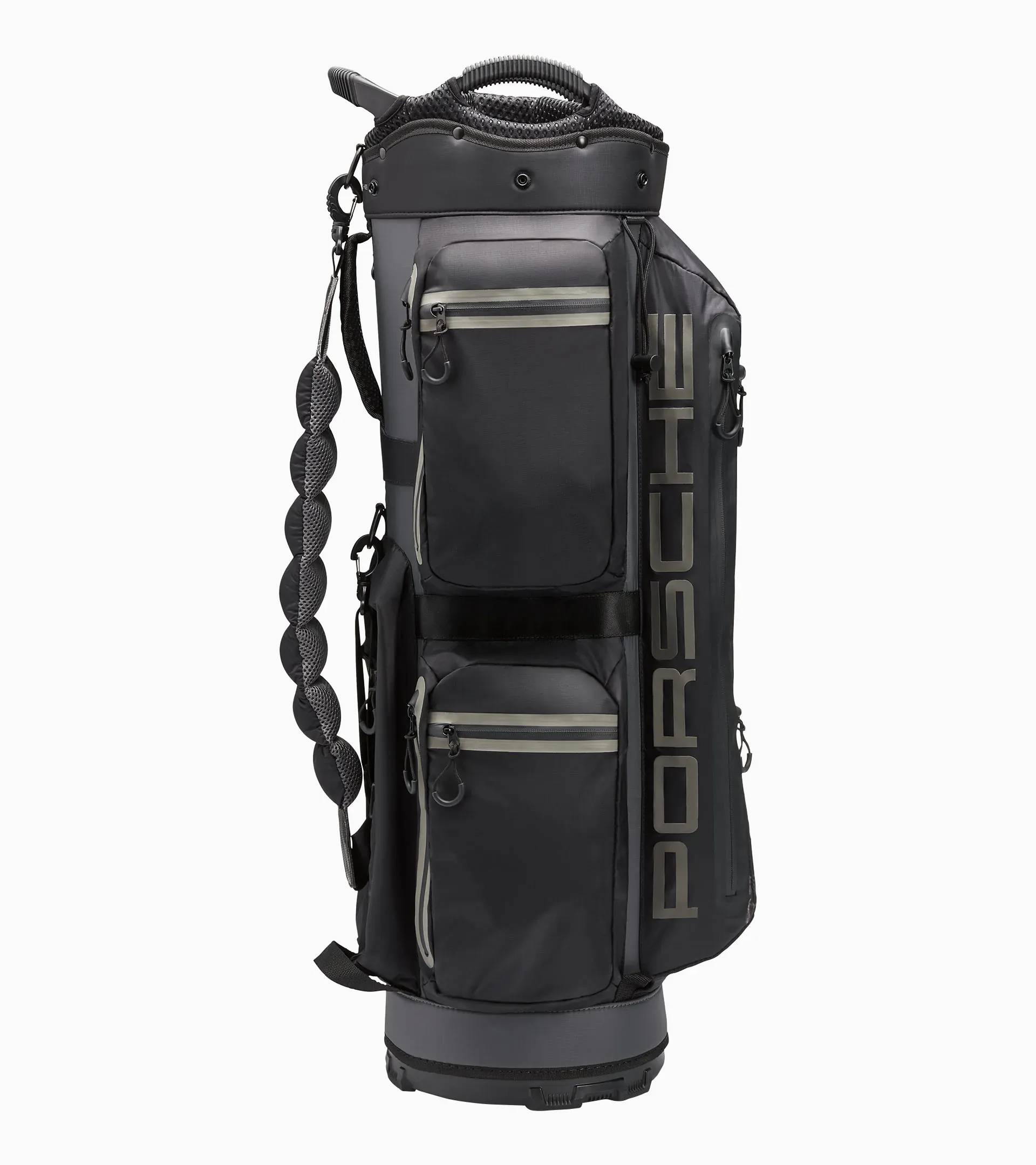 The cart bag is made of coated, water-repellent material and is the ideal caddy on the golf course. Clubs can be optimally organised thanks to its spacious 4-way divider. The bag is particularly easy to transport thanks to the comfortable, balanced and adjustable carrying system. Six pockets and additional umbrella, glove and towel holders offer sufficient storage space for all the essentials. There is a 'PORSCHE' silicone print on the side.