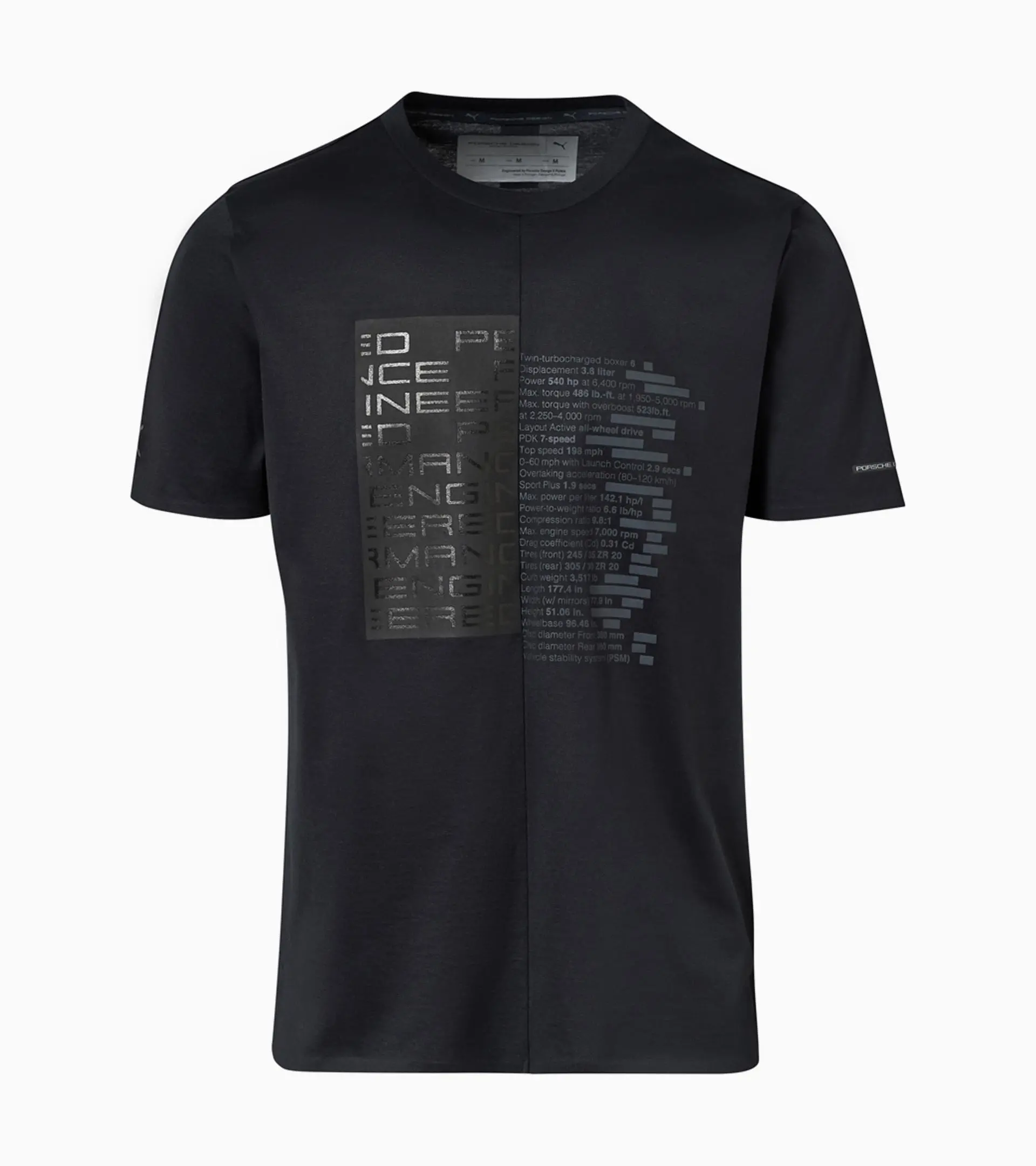 The Porsche 911 Turbo: the iconic reference for every collection from Porsche Design. Here, the tech specs of the 911 Turbo were the inspiration for the abstract typographic patterns that give the Porsche Design Graphic Tee its name and unique look. Subtly exclusive – like the lustrous sheen of soft, mercerized cotton, clean-cut bonded hem and side slits with lime green detailing. Design and comfort at their best.