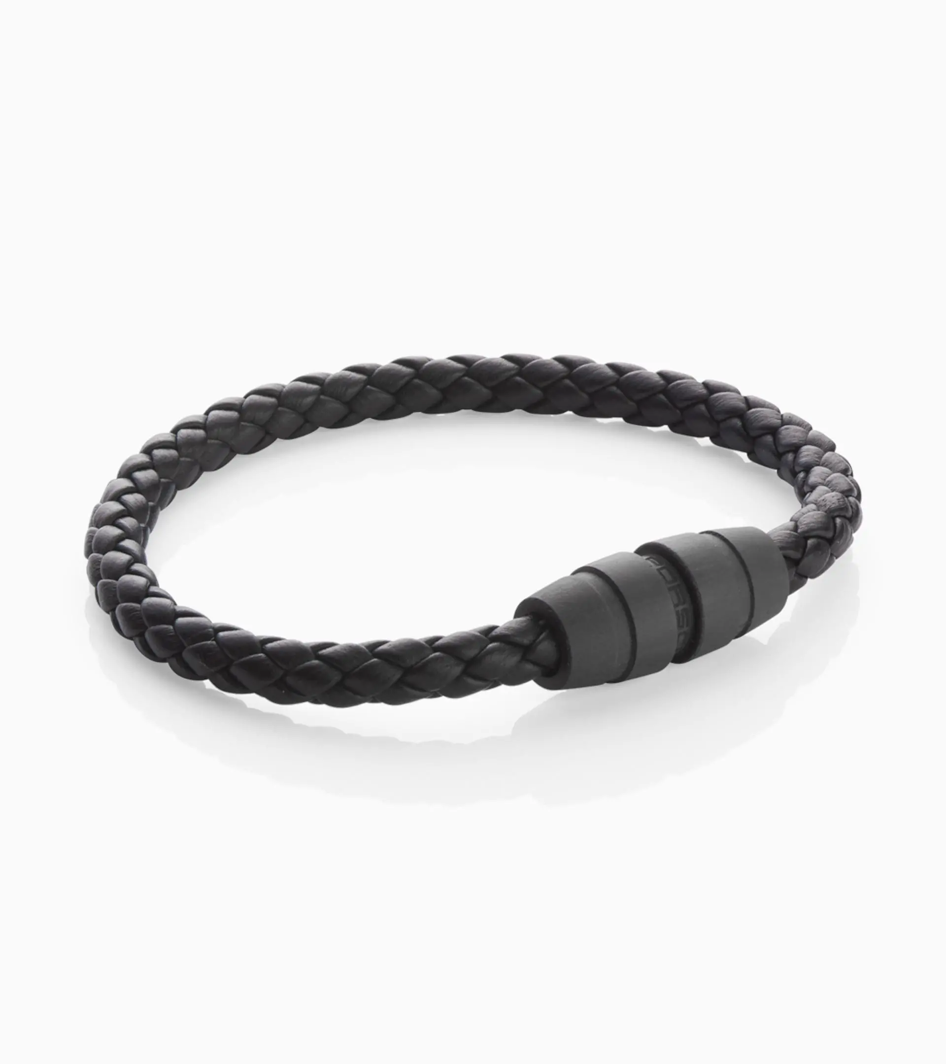 The extra-wide bracelet, braided using six strands of leather, forms a distinct contrast to the magnetic clasp for a masculine look that is at once bold and casual. Beyond spectacular looks and a color that varies with the lighting, the ultra-light carbon clasp offers maximum performance. Unlike stainless steel, it doesn’t overheat in the sun – so you can wear it without worries wherever your day takes you.