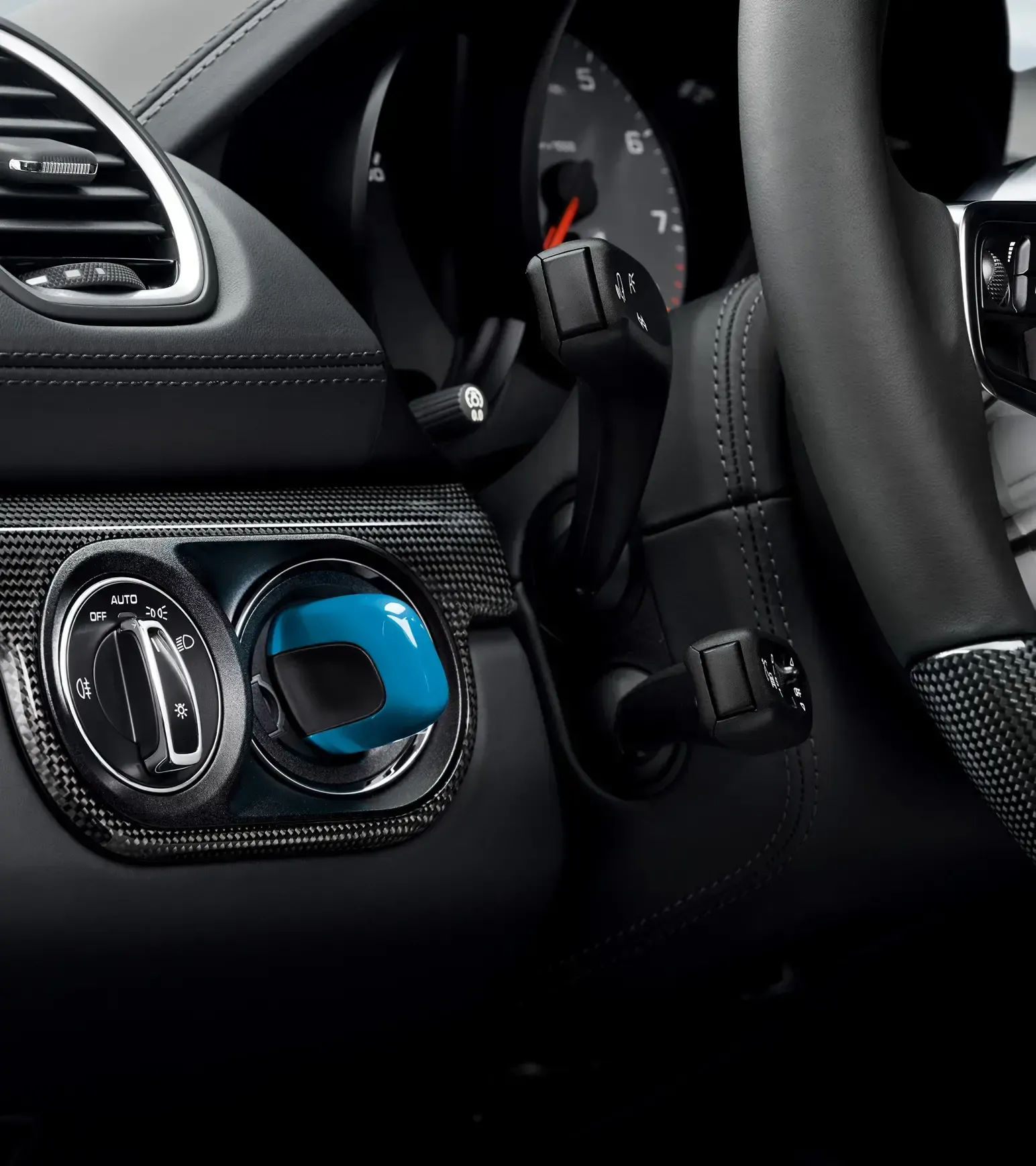 Personalize your Porsche with this painted ignition starter switch, now available in the vibrant "Miami Blue" color to seamlessly integrate into your vehicle's design