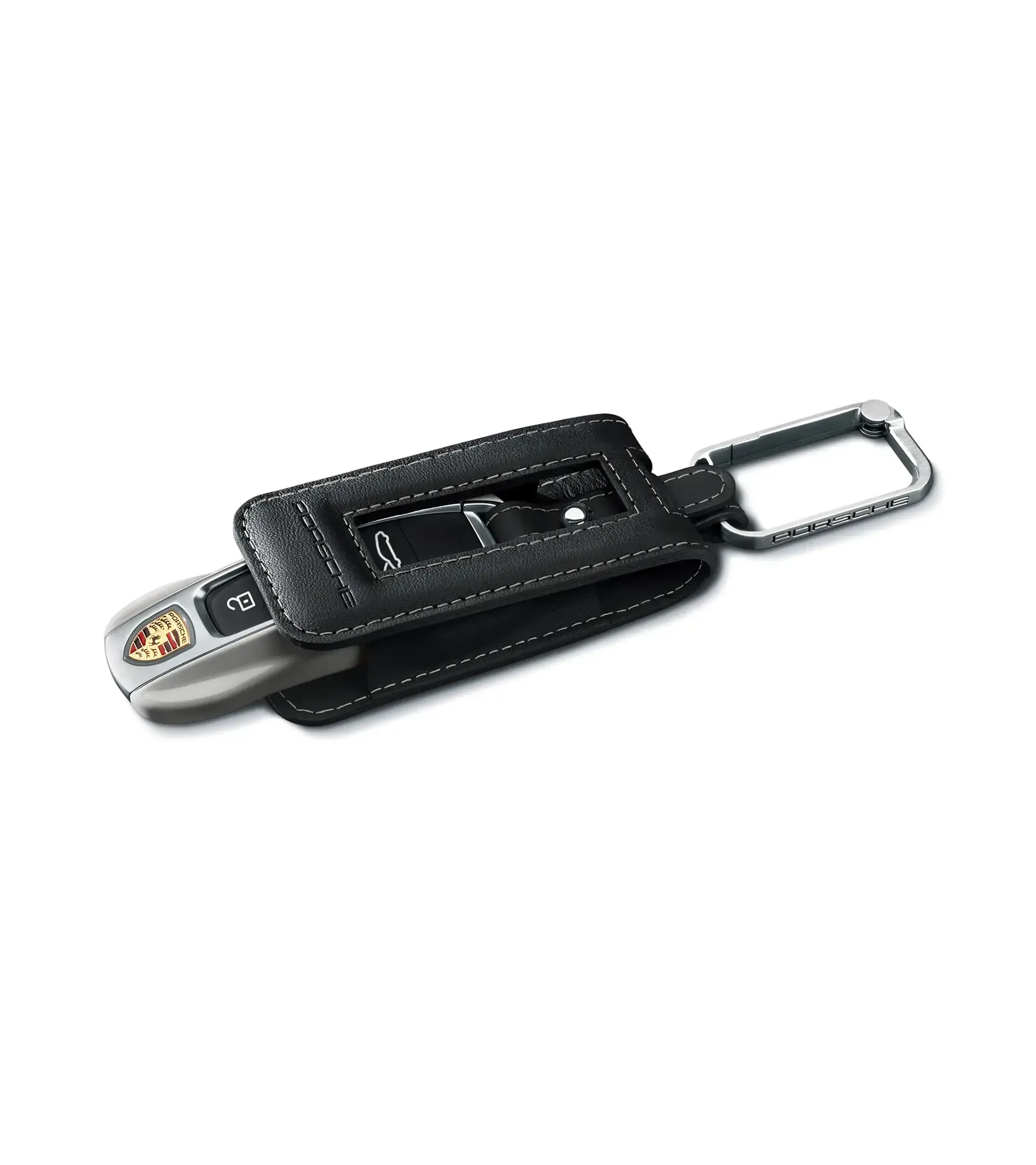 Porsche key pouch in smooth-finish black leather with embossed Porsche crest and logo, decorative stitching and stainless steel carabiner.