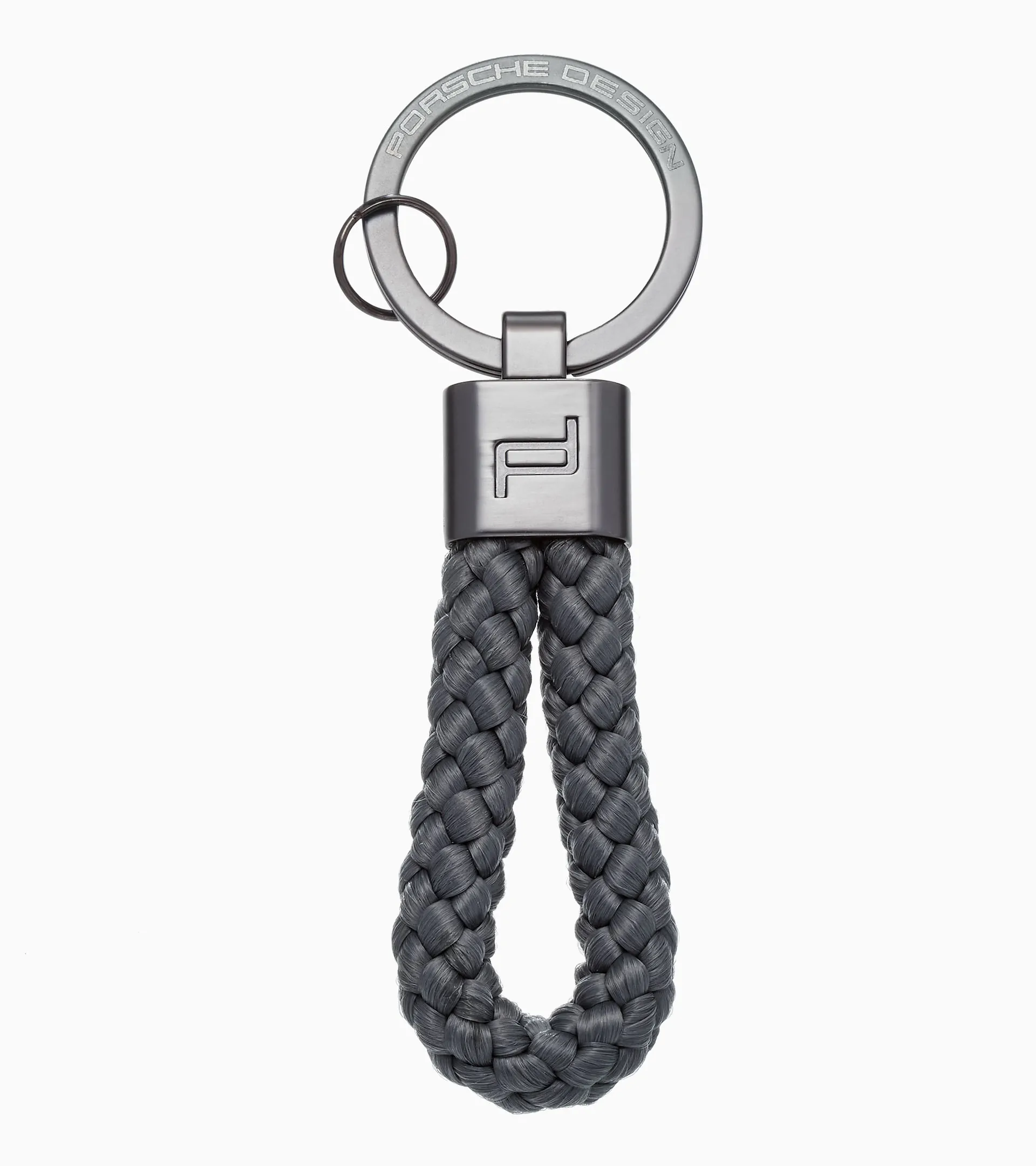 Elegant designer key ring with braided rope and split ring. Key ring with laser-engraved Porsche Design logo.