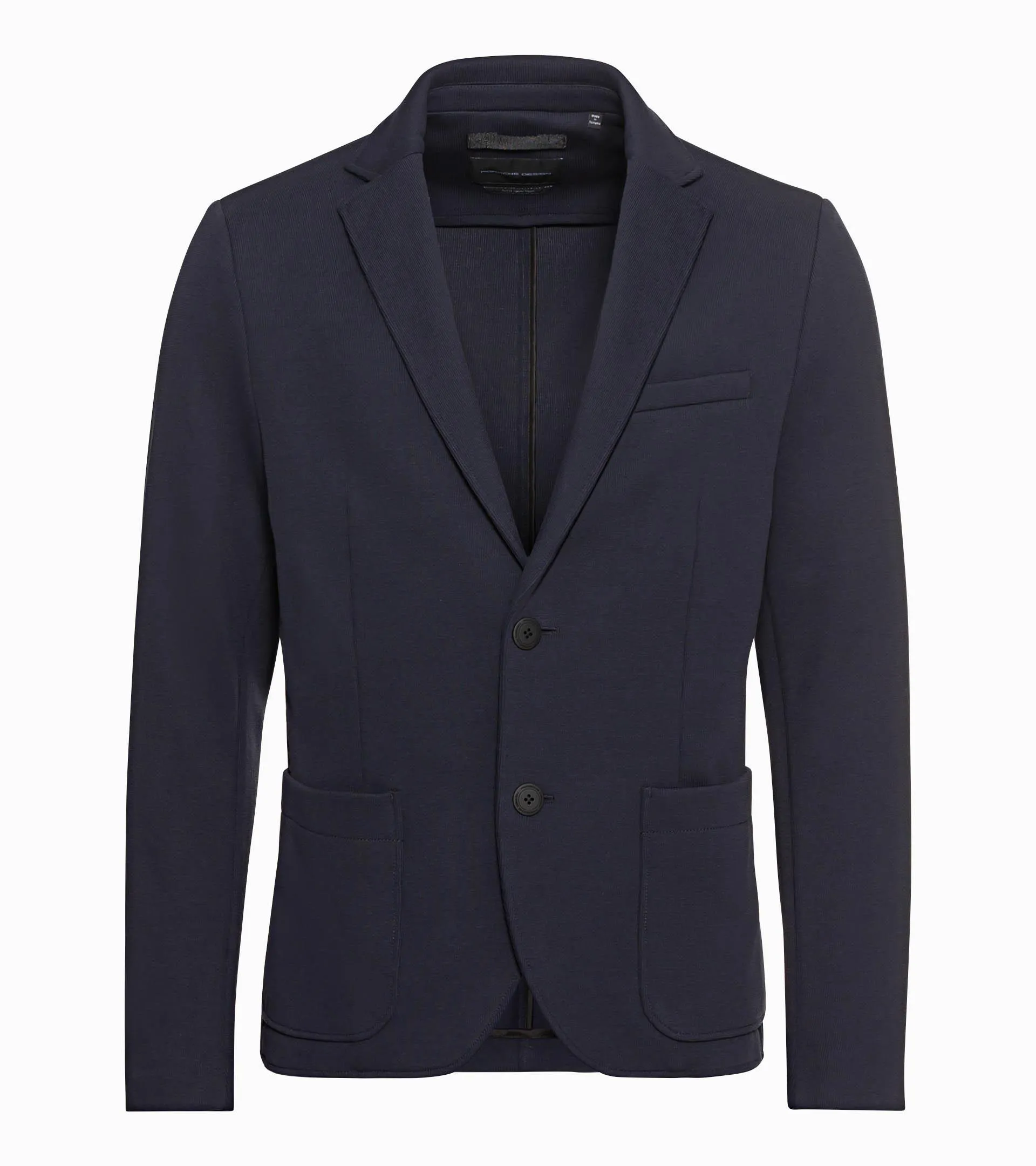 Soft. Exclusive. With a look and feel like no other. The Porsche Design Luxe Summer Knitted Blazer interprets performance in a new way. The fine two-way stretch knit fabric made from recycled polyamide fibers gives the lightweight blazer a fascinating texture that is further accentuated by the color of the sports jacket. The slim fit and straight sleeve hems with no buttons add to the modern look. Sewn-on slip pockets, a chest pocket, and the half-lined lightweight interior are not just stylistic details, they also guarantee maximum functional comfort. Whether worn as a sophisticated alternative to a cardigan, paired with denim or with matching Luxe Summer Knitted Pants as a casual, summer suit, the blazer has the potential to become a firm favorite.