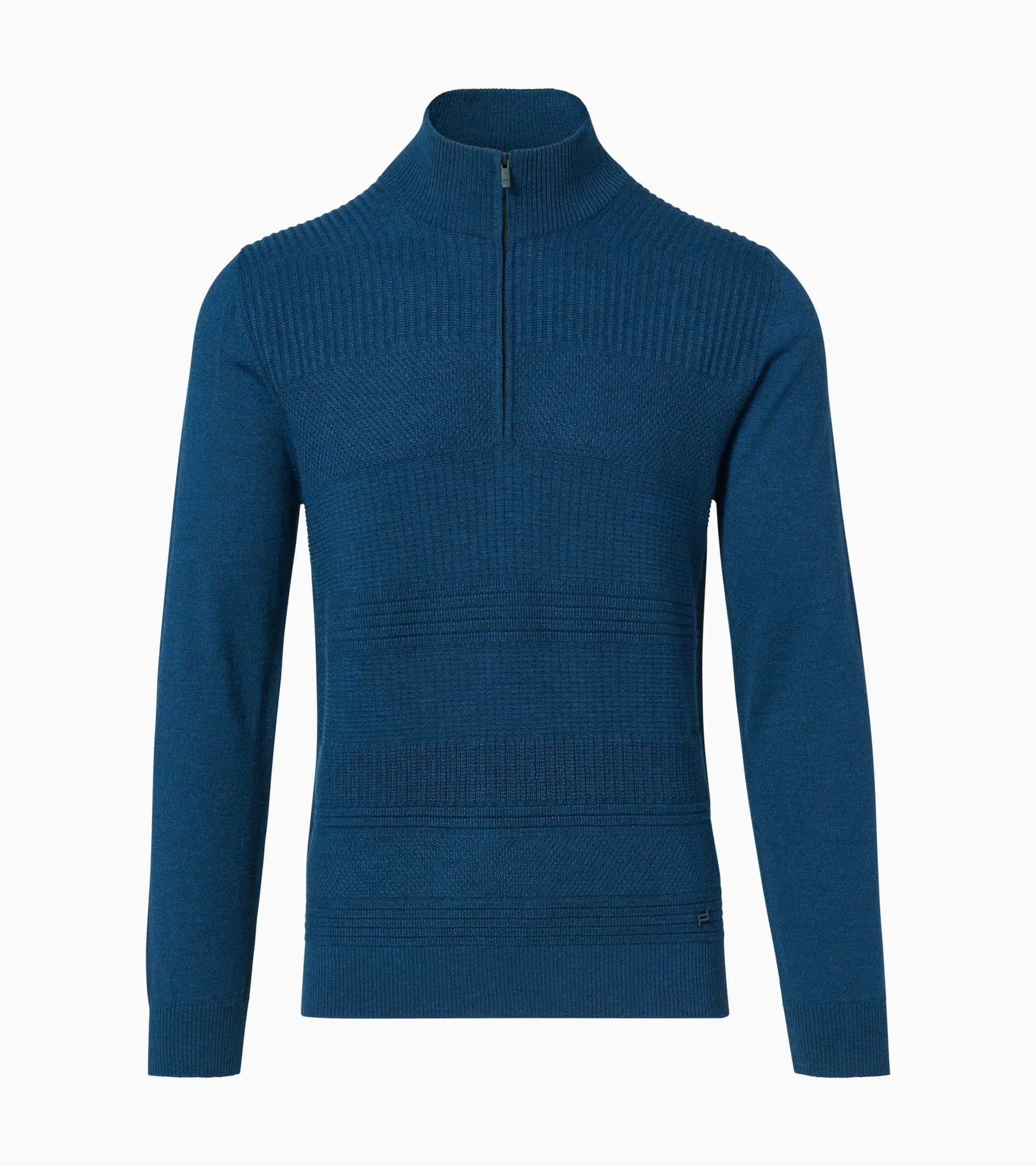 Dynamic style and comfort: the luxurious Porsche Design Mock Neck Zip Sweater effortlessly fuses seeming opposites into a single timeless design. The distinct knit sweater is produced in small batches in Italy. A stylish stand collar with matte black zipper gives this straight-cut men’s piece a classic, elegant component. The full intarsia knit in modern mélange wool and various textures infuse the piece with a dynamic appeal – and a slightly daring streak. The final, exclusive touch is a hand-sewn metallic PD-Icon on the hem. Wear it over a dress shirt for a classic look or combine it with Porsche Design Iconic Logo Sweat Pants for laidback style – this merino sweater is ready for it all.