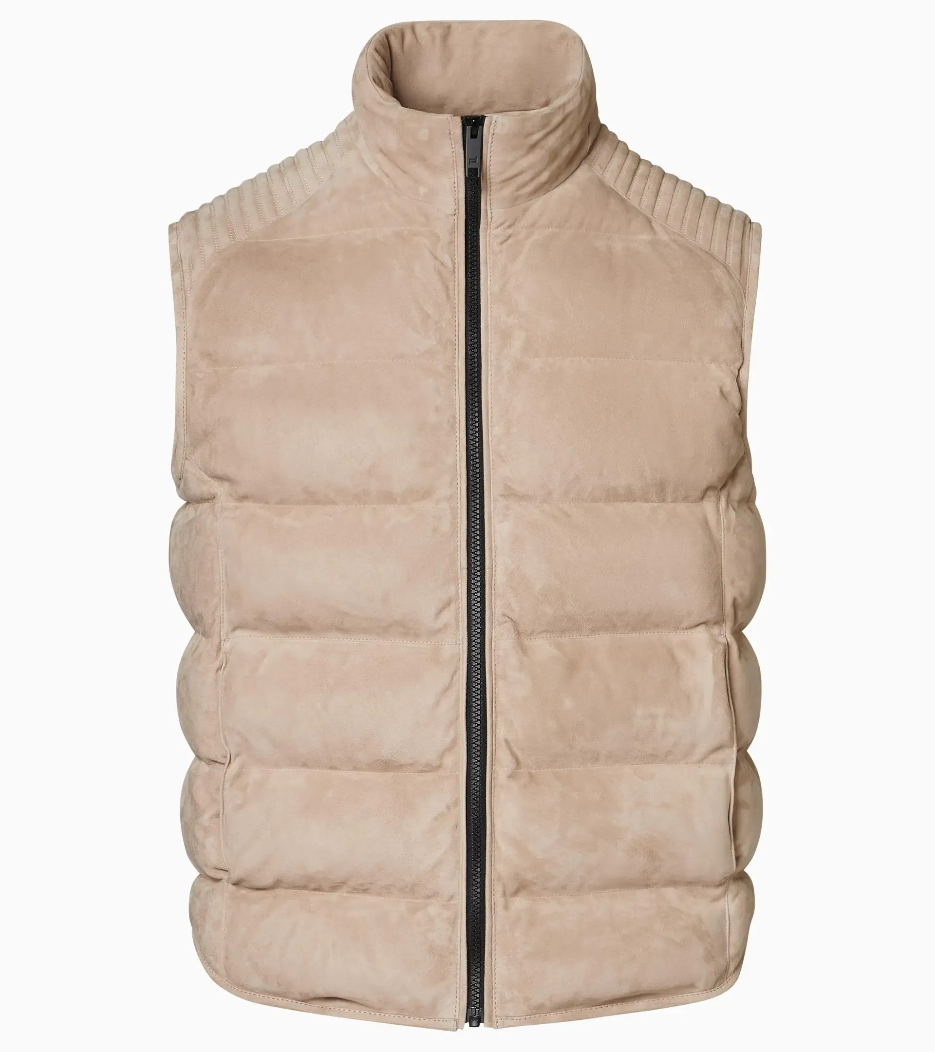 The Porsche Design version of the quilted gilet: exciting material, exclusive design, multifunctional use. The Porsche Design padded goat suede vest made of fine goat suede is the perfect solution for cooler days and long summer evenings. The patented Freudenberg padding warms like down, but is sustainably produced. 3D stitching on the shoulders and invisible pockets with magnetic closures give the design a dynamic look and a technical finish—an exciting contrast to soft leather. Styling tip: This creates a cool Italian style in combination with the Porsche Design hybrid blazer, the long sleeve polo, travel pants and the striking MotoTraveller LU carbon sneakers!DETAILS: • Quilted men's gilet made of goat suede • Patented, down-free Freudenberg comfortemp® padding. 3D stitching on the shoulders • Invisible pockets with magnetic closure • Front zipper with leather piping • Embossed Porsche Design logo on the back collar seamMaterial: upper: 100% goat suede, filling: 100% polyester, lining: 51% acrylic/49% viscoseCare Instructions: Do not wash. Do not bleach. Do not tumble dry. Cold iron. Dry-Cleaning possible.