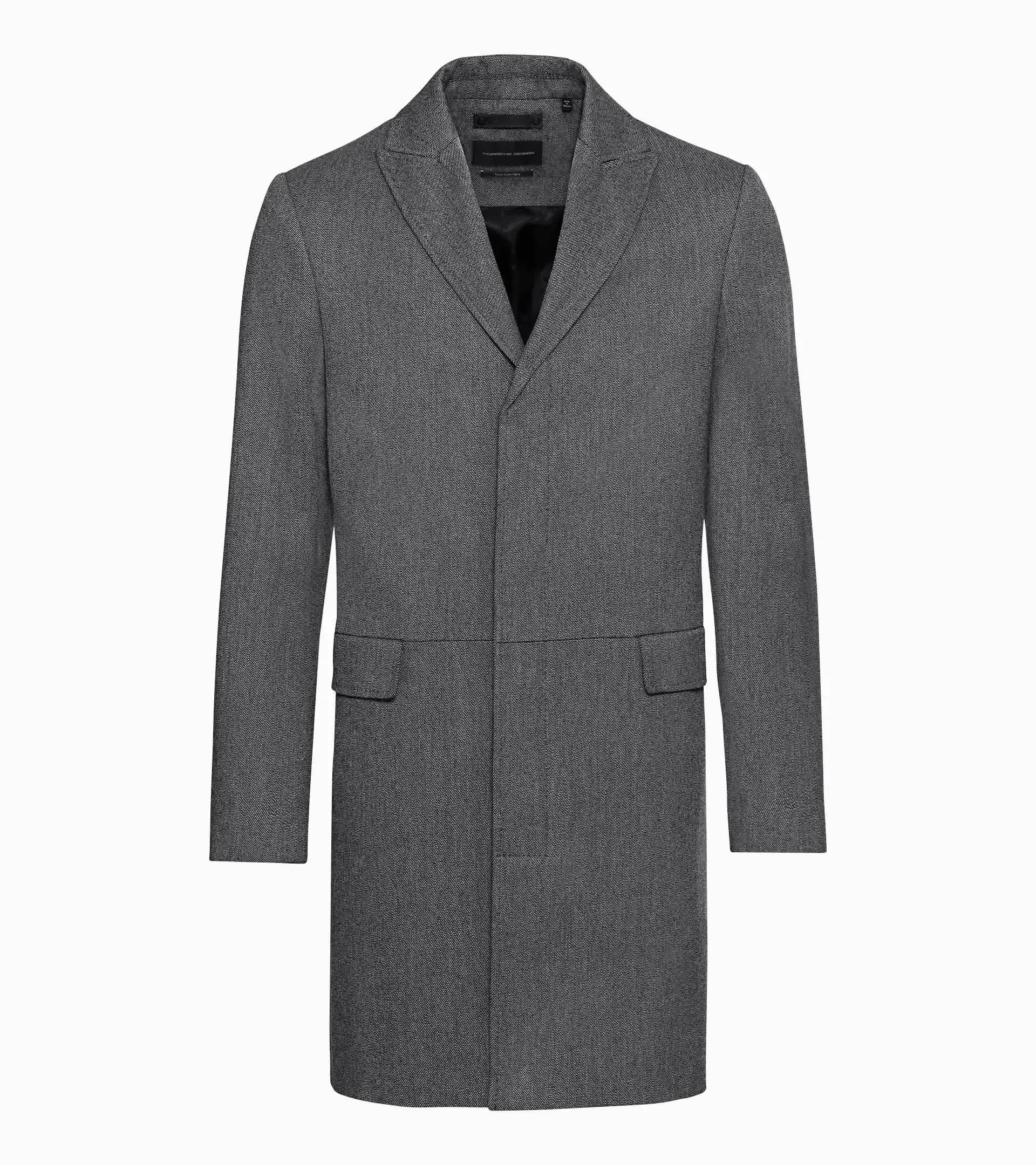Cut to maximum style: With its clean design and high-quality, mottled gray outer fabric, the Porsche Design Peak Lapel Coat perfectly handles the interplay between business and casual. Made from the finest Italian fabric, this classic coat looks as exclusive as it is modern thanks to its minimalist design, slim fit with a rising lapel collar and material mix with a water-repellent finish. The distinctive character is also evident in the details. A concealed button placket with buttons made from genuine Italian horn on contrasting tape, Porsche Design logo piping on the inside and the leather collar bridge with Porsche Design embossing give the coat and wearer a distinctive, exclusively modern style.