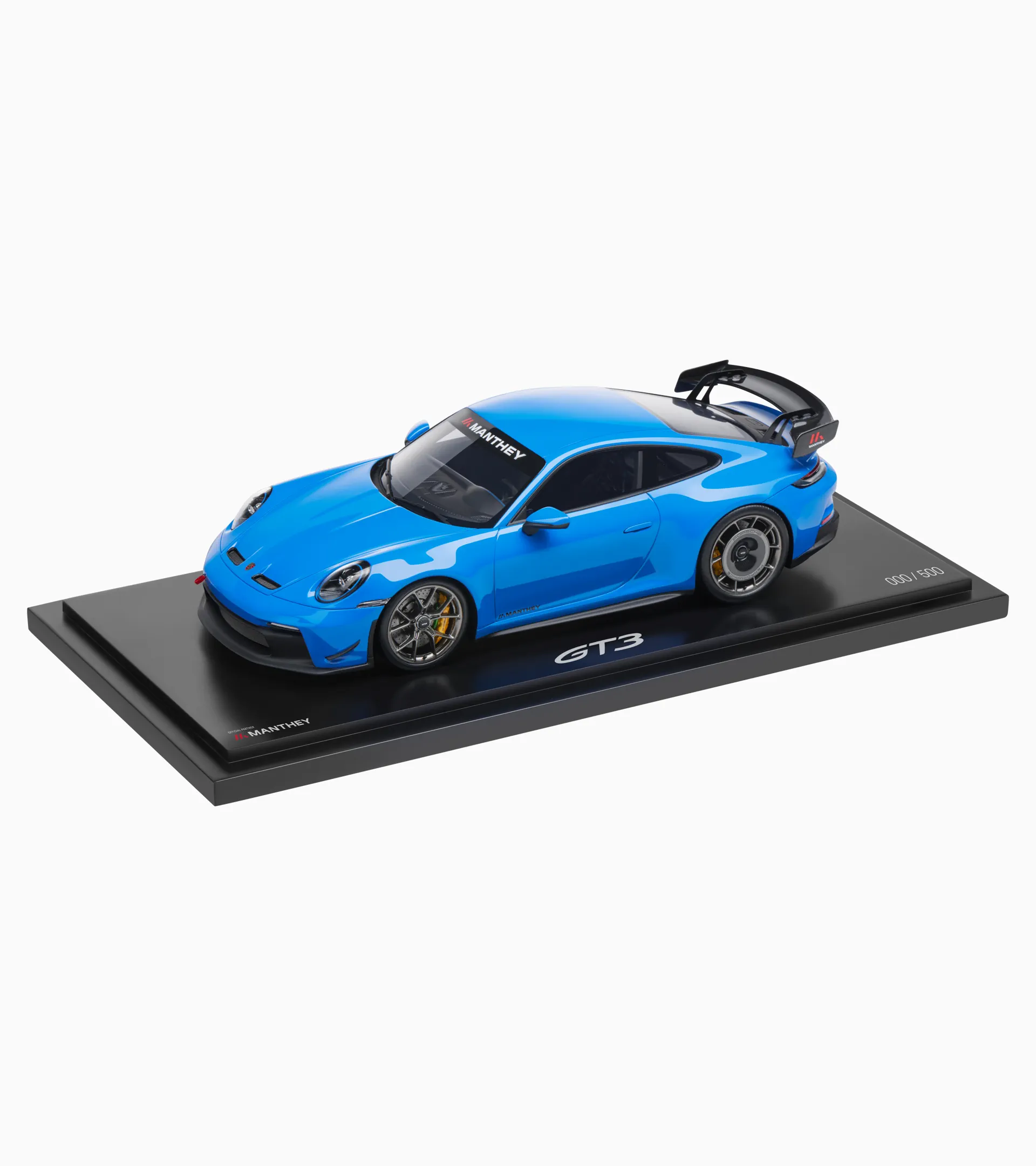 The exclusive 1:18 scale model of the Porsche 911 GT3 992 with Manthey Kit showcases impressive attention to detail and deserves its place in any collection. The packaging provided also makes it the perfect gift for all Porsche fans. Made of resin. Shark Blue exterior, Black interior. Limited to 500 units.