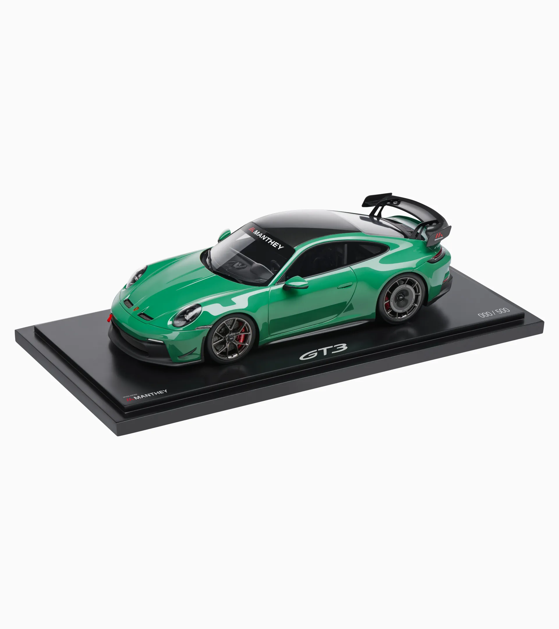 The exclusive 1:18 scale model of the Porsche 911 GT3 992 with Manthey Kit showcases impressive attention to detail and deserves its place in any collection. The packaging provided also makes it the perfect gift for all Porsche fans. Made of resin. Auratiumgreen exterior, Black interior. Limited to 500 units.