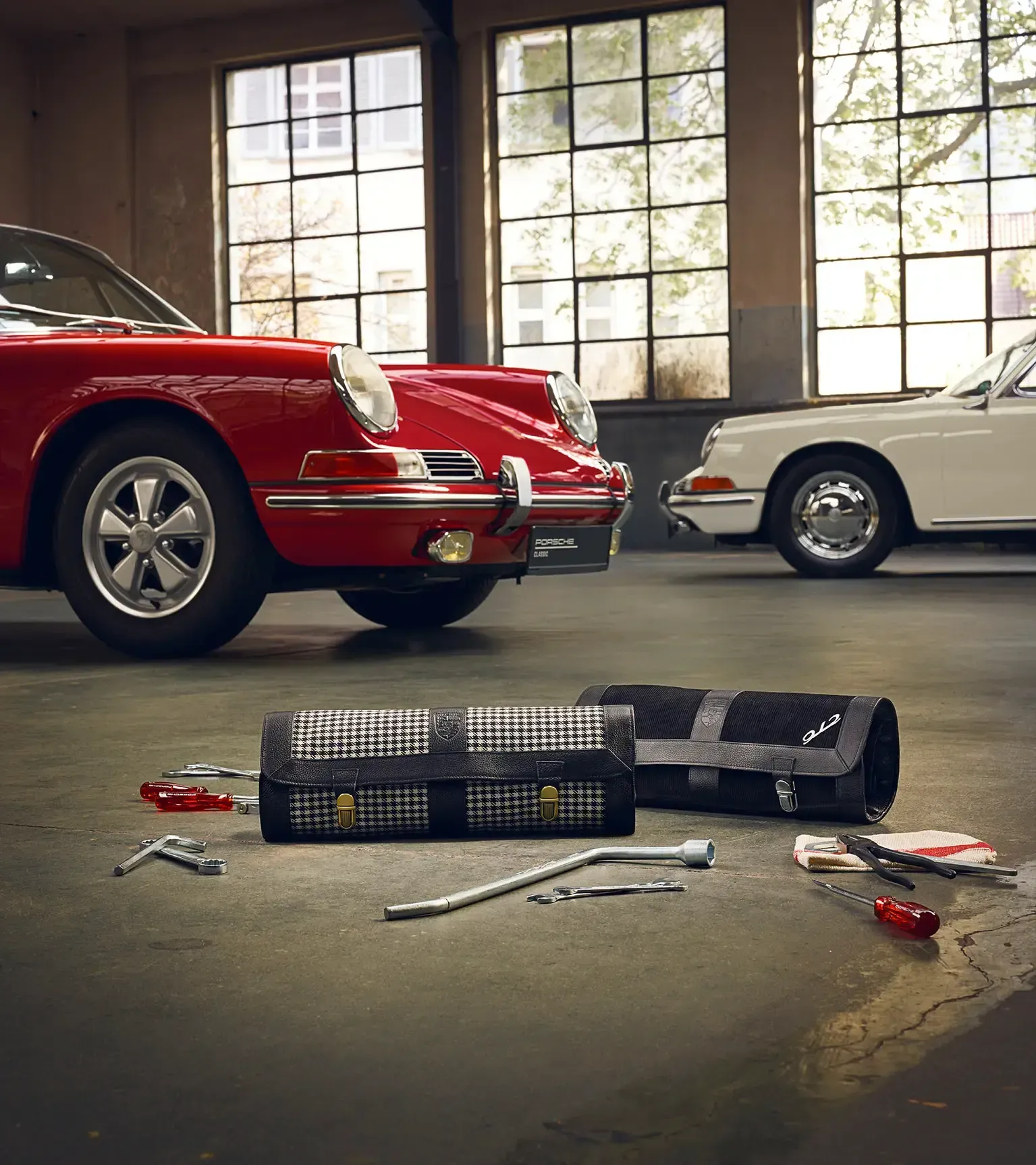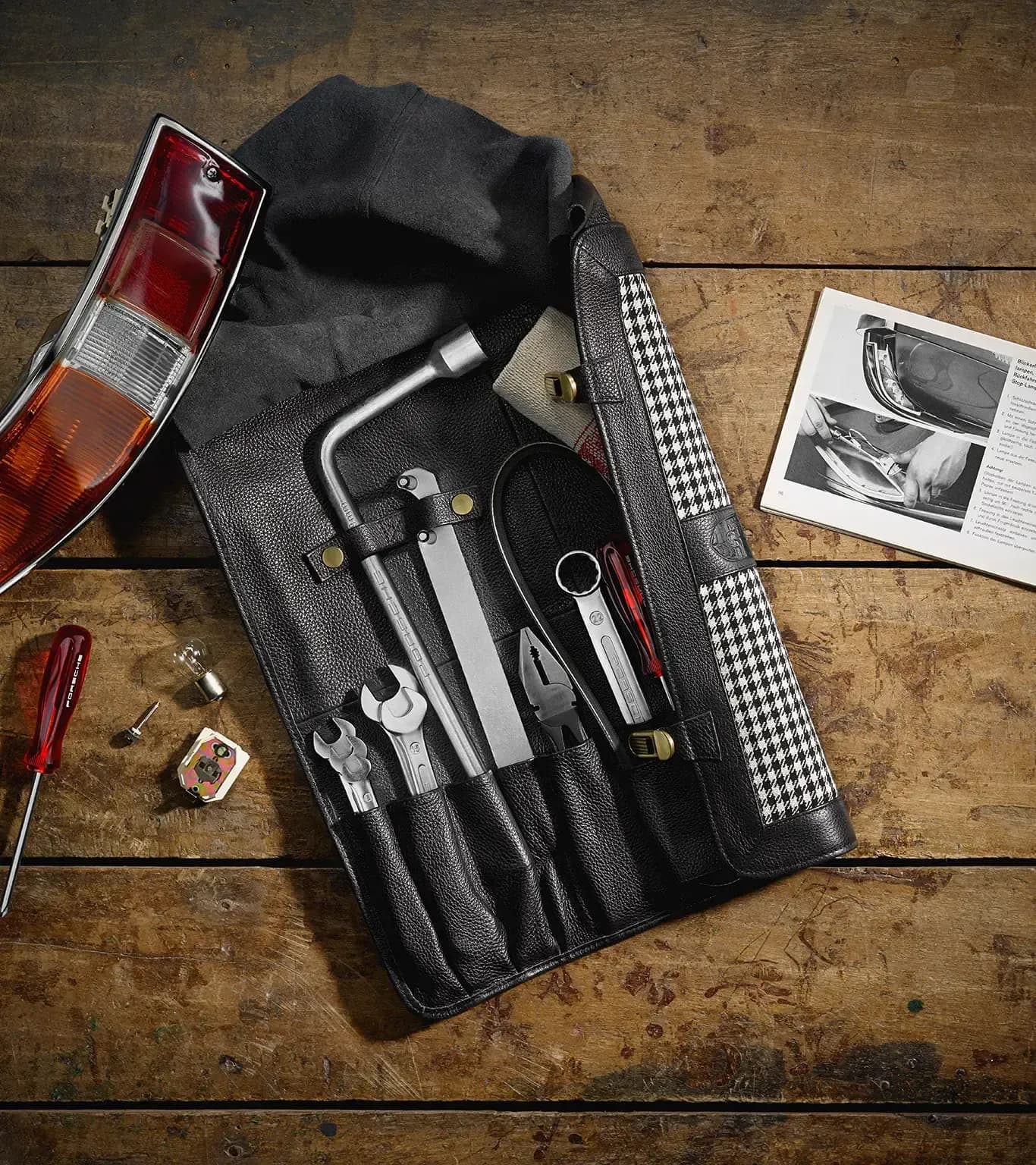 Porsche Classic tool bag; suitable for all Porsche 911 F from model years 1965 to 1973. Contents: 5x double open-ended spanners (one each 8x9, 10x11, 12x13, 14x15 and 17x19), 1x wheel nut spanner 19, 1x holding tool for V-belt pulley, 1x combination pliers, 1x combination spanner 19/22, 1x Phillips screwdriver B2, 1x screwdriver, 1x spark plug spanner, 1x spark plug ratchet spanner, 1x Allen key, 1x brush 1x feeler gauge, 1x V-belt 9.5x710, 1x cleaning cloth. In addition, the real leather case combines a high-quality pepita houndstooth look with a highly functional design, with a particular slot for each tool. Based on the genuine parts, the tools have been produced, improved and are now embellished with Porsche lettering. Tested by our Classic experts, the new 911 tool bag meets the highest standards of functionality and quality.