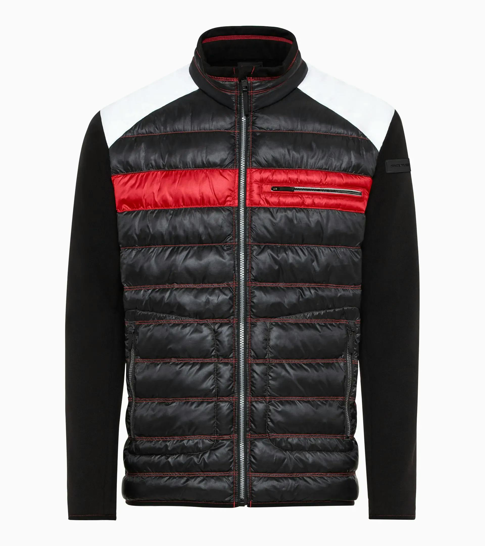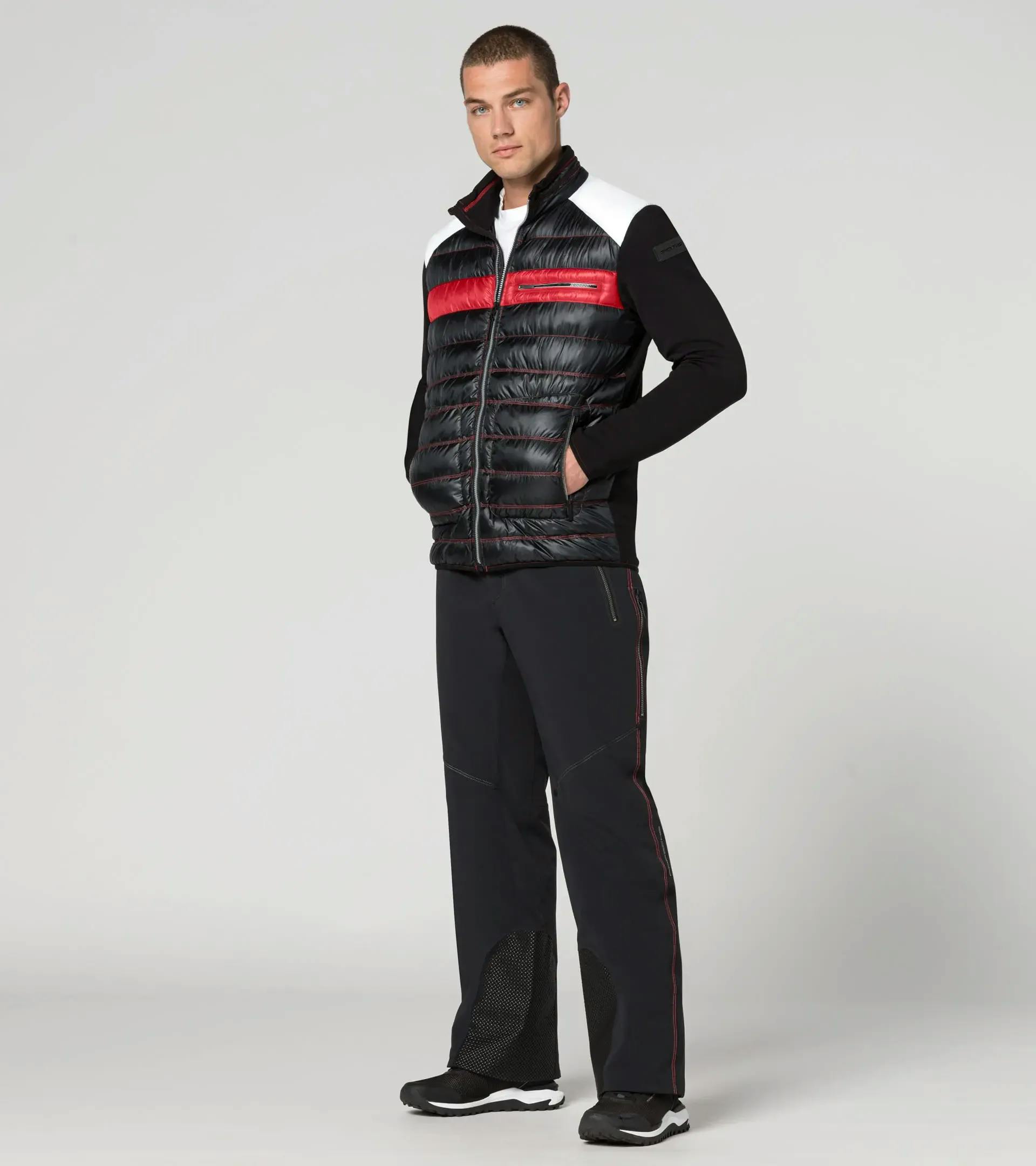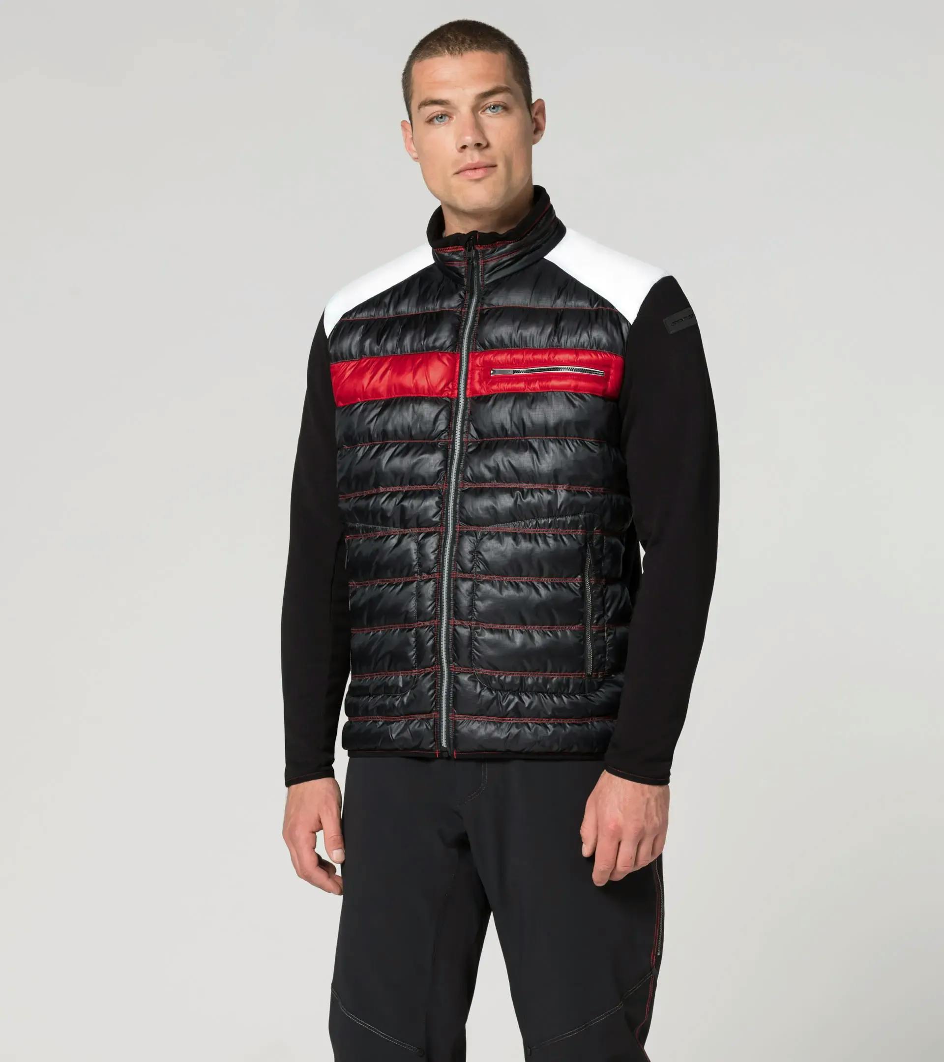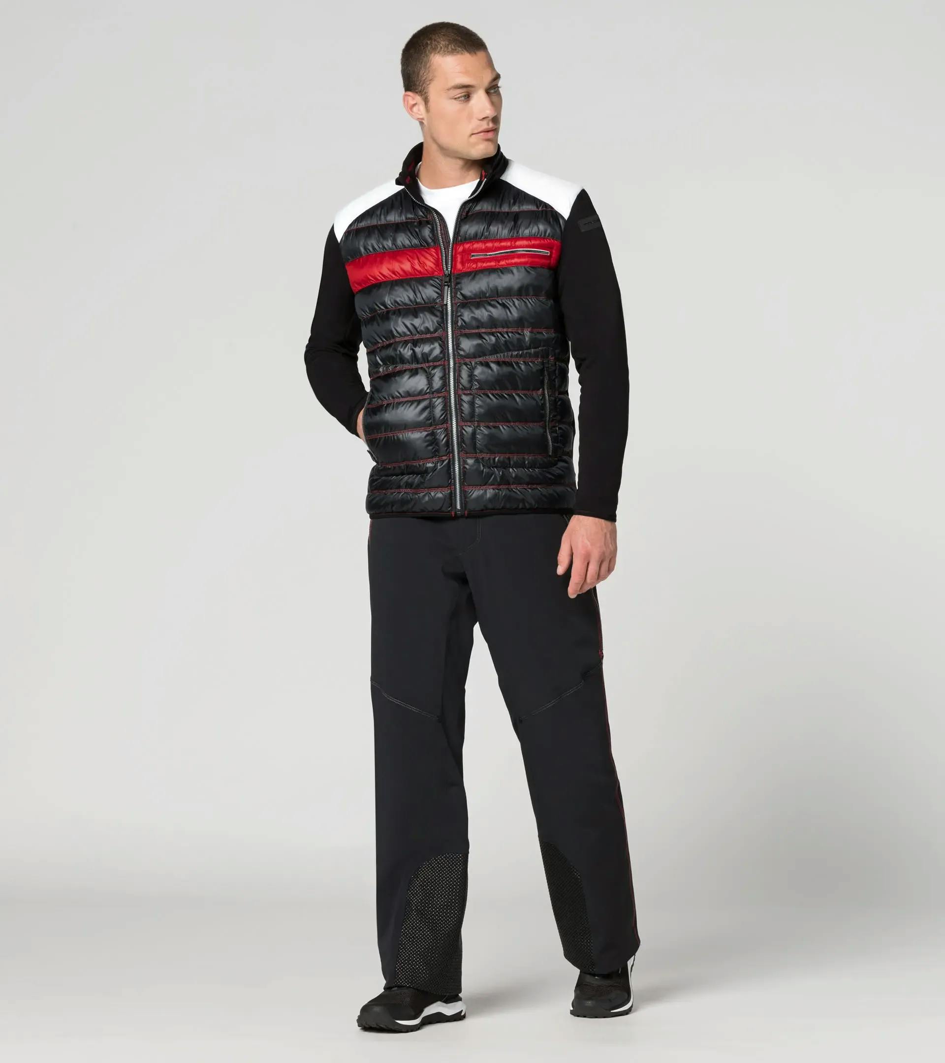Dynamic even when standing still: ThePORSCHE | HEAD Midlayer from the new PORSCHE | HEAD Capsule Collection. This second-layer jacket, like the matching PORSCHE | HEAD Ski Jacket and Ski Pants, transfers the drive from Porsche onto the slopes of the world and impresses with its clever concept and a design inspired by Porsche Motorsport. The midweight hybrid construction adapts perfectly to every movement thanks to body-mapped brushed power stretch for the back and sleeves. The horizontally quilted front made of lightweight ripstop is warming, thanks to the PrimaLoft padding – like a down lining, yet more robust and not affected by moisture. The exclusive wearing comfort is given a final touch with the softly lined stand-up collar, stretch cuffs on the sleeves and hem and light YKK VISLON® zips on the front, breast pocket and side pockets.