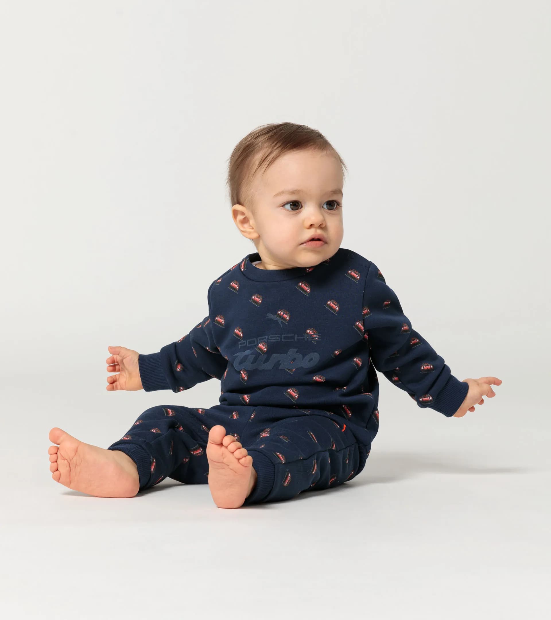 Inspired by the unmistakable design of the Porsche 911 Turbo, the Porsche Legacy Collection offers style and performance for everyday life. The sweater and jogging bottoms set for smaller Porsche fans is particularly impressive thanks to its comfort and design and the iconic all-over print of the 911 Turbo. Snap fasteners on the shoulders make for easier putting on. The Porsche Turbo print on the chest rounds off the detailed look.