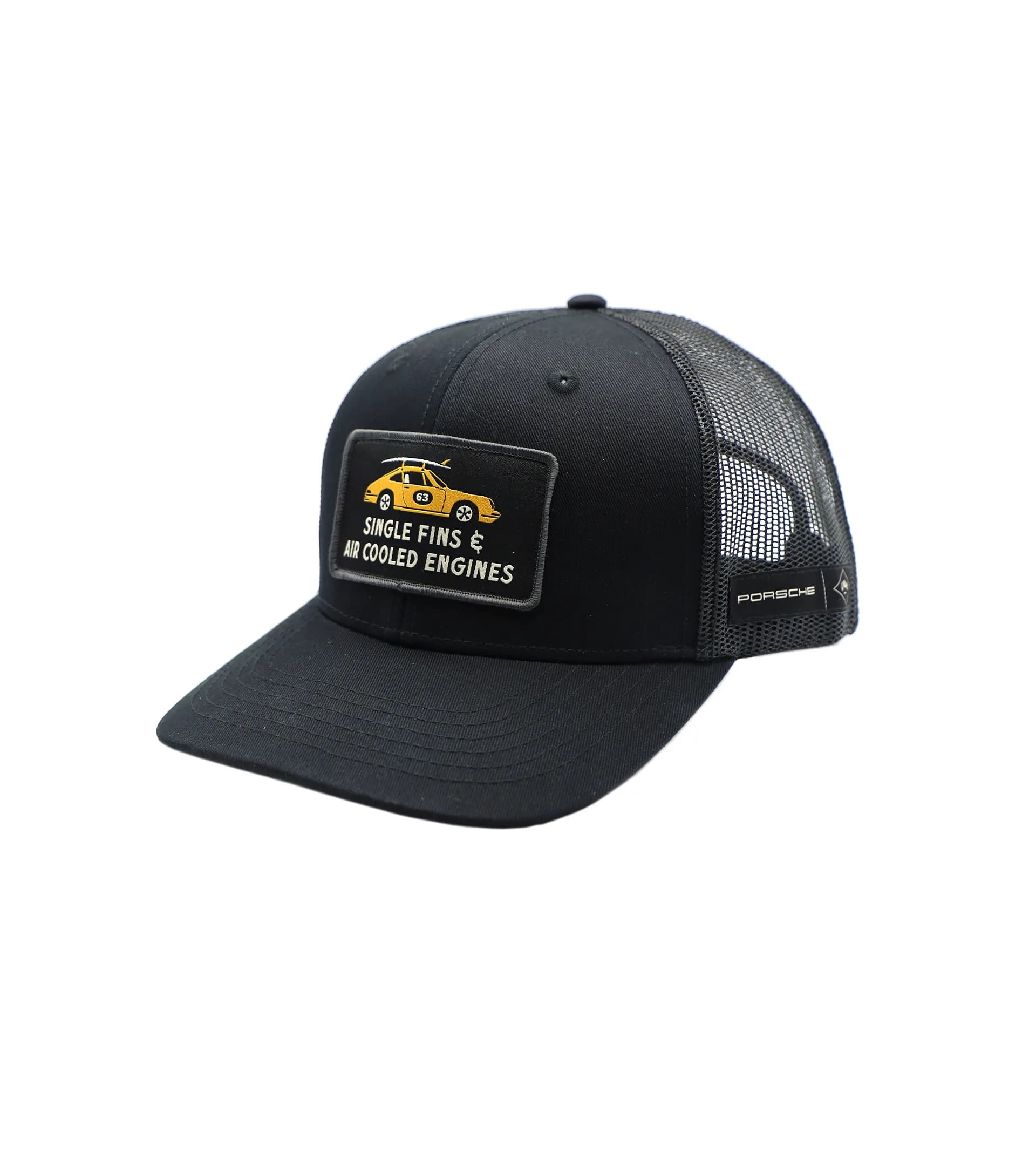 Porsche and Almond Surfboards - a collaboration born in California. Cool black trucker cap with mesh fabric on the back and "Single Fins & Air Cooled Engines" patch on the front and woven Porsche x Almond label on the side makes this cap a must-have for all Porsche fans.
