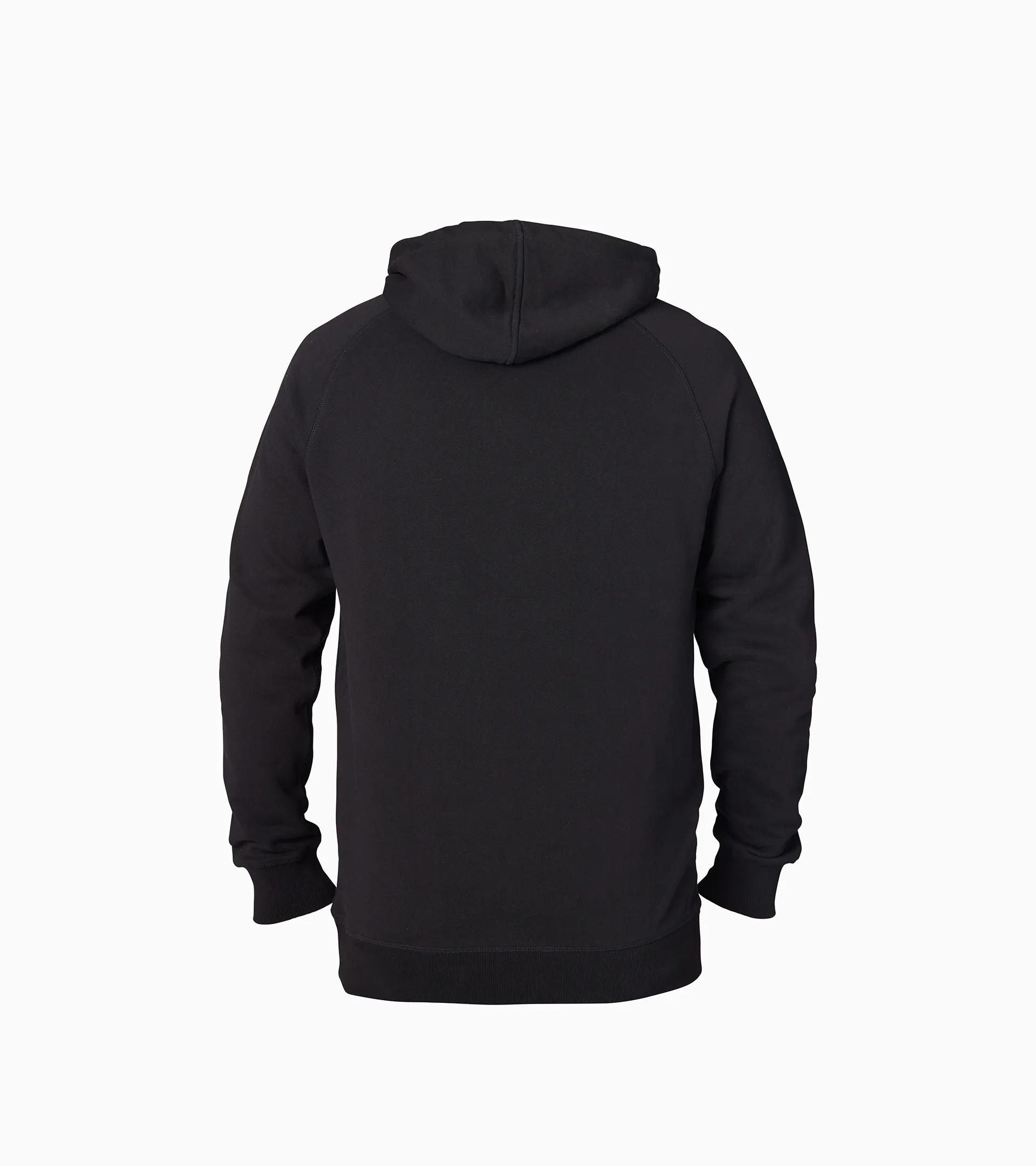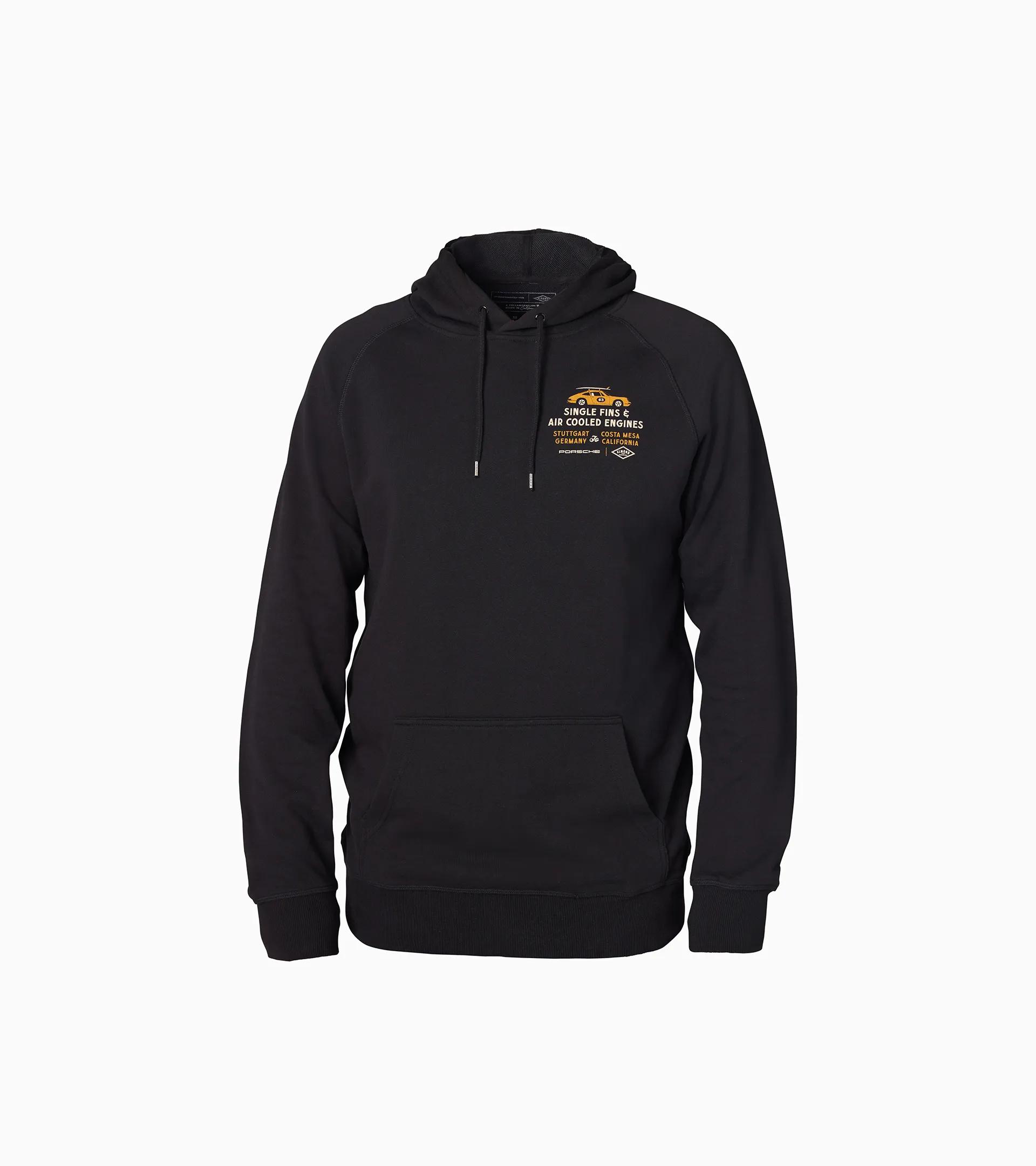 Porsche and Almond Surfboards - a collaboration born in California. Laid-back, California cool pull-over hoodie in black with "Single Fin & Air Cooled Engines" print on the front. Printed in California.
