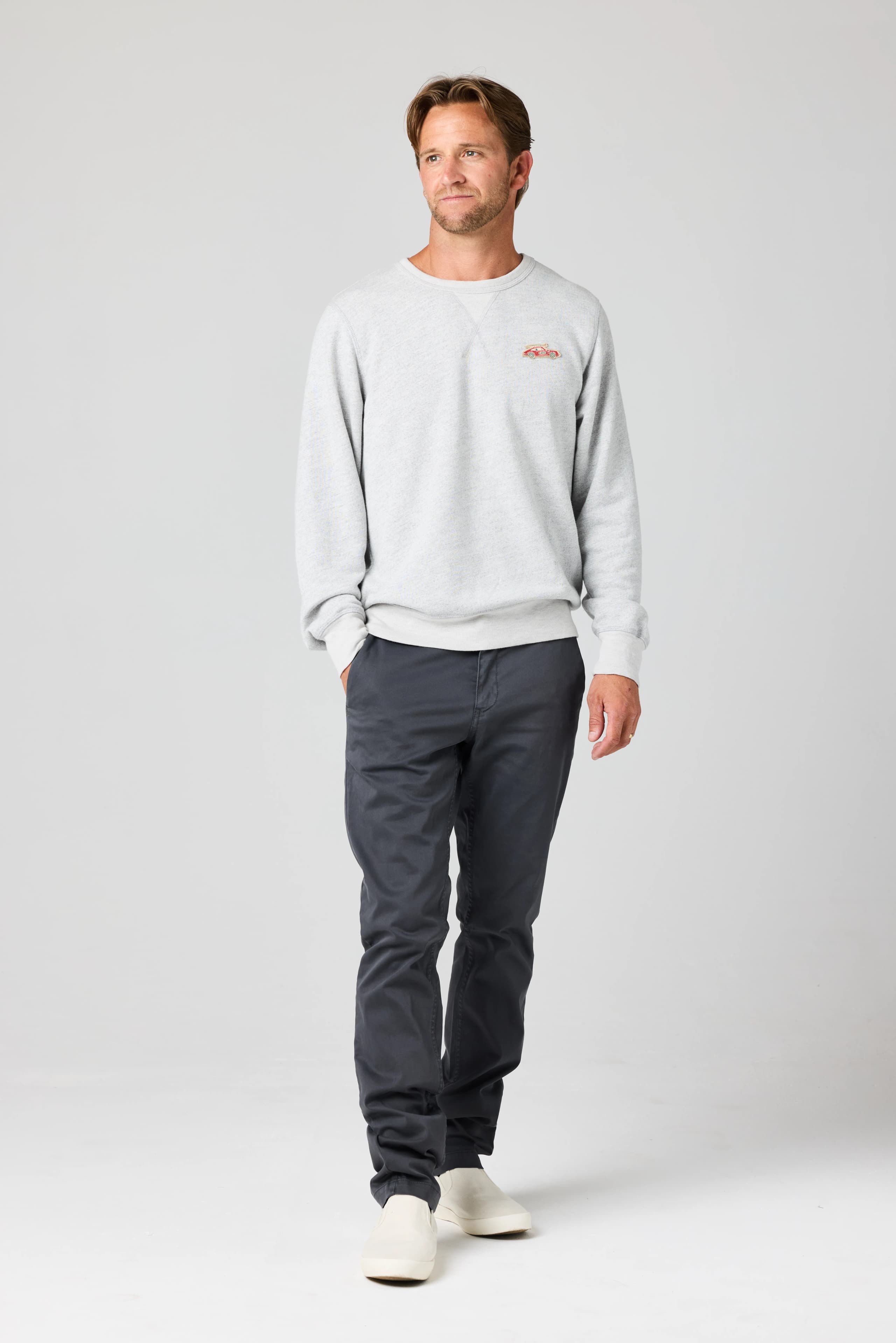 Laid-back, California cool sweatshirt in heather grey with red Porsche x Almond 911 patch. Relaxed fit.