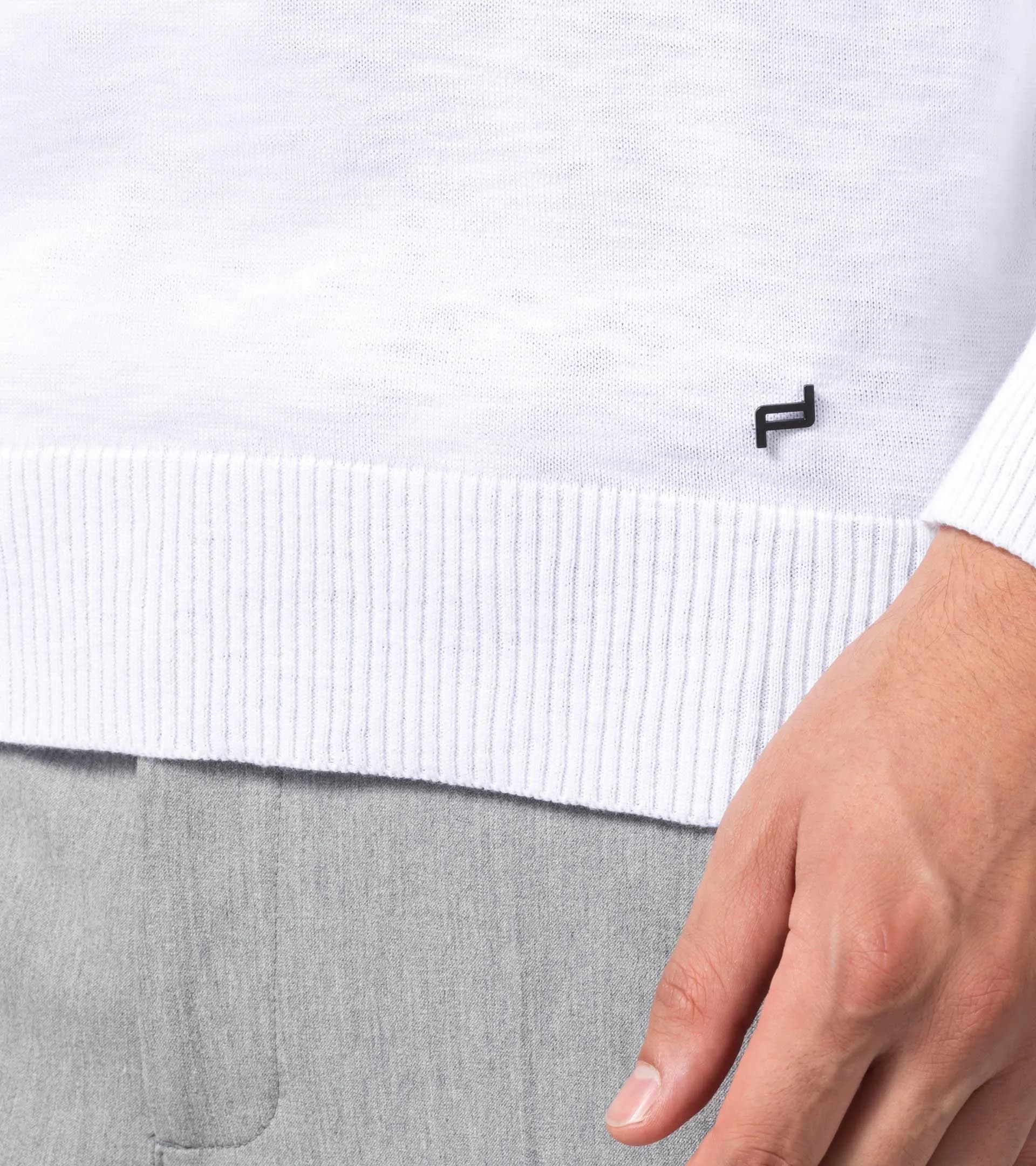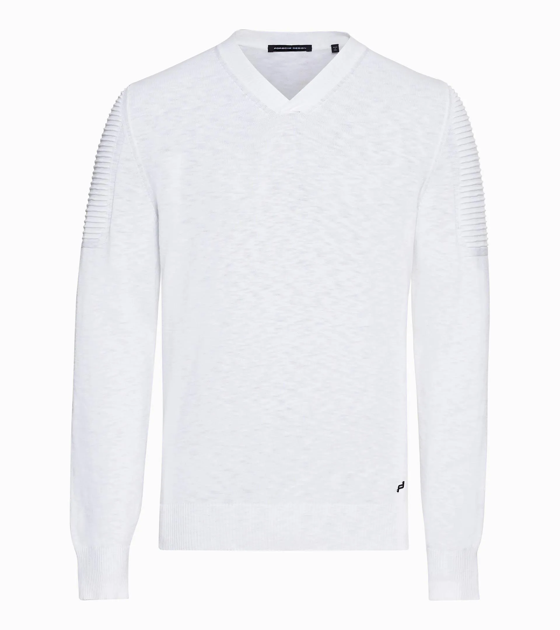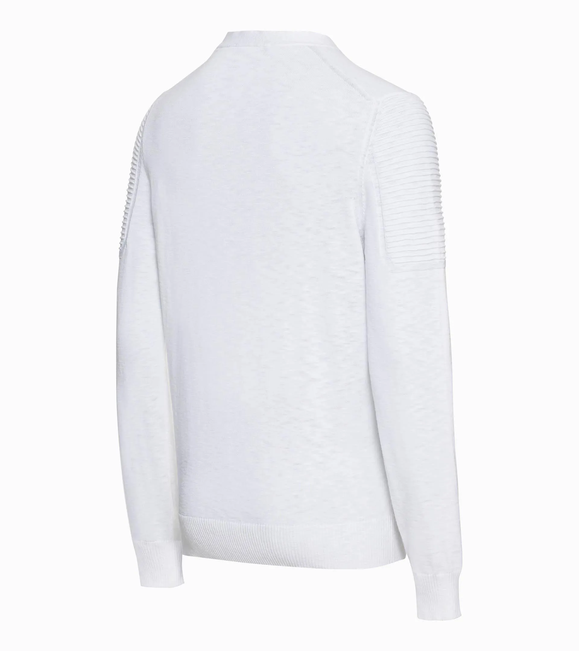 The sweater with visibly more HP. The sporty details of the lightweight Porsche Design Racing Detail Sweater give it its dynamic look. The super-fine Italian cotton fabric with a marl look feels light enough to wear in summertime, but is given a dynamic upgrade by the eye-catching motorsport-inspired textures on the upper arms, a waffle-look front, and a hint of a sporty roll collar. The finishing touch is a metal PD icon on the hem, sewn on by hand. All in all, a sure style winner.
