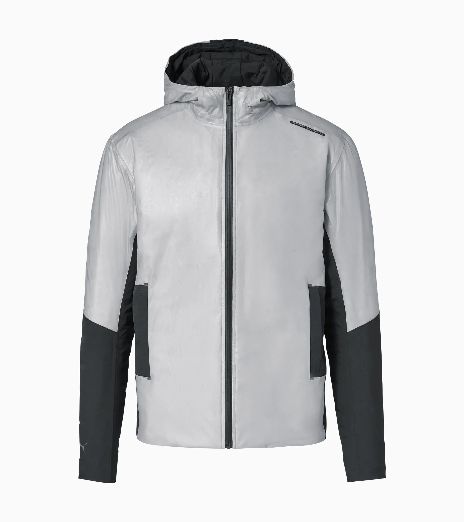 Maximum style and performance: the ultra-lightweight Porsche Design RCT Jacket. This sporty men’s jacket features dynamic color-blocking with stripes on the back, dark side panels and a modern cut for striking daytime style. After absorbing the sun’s rays, the Italian technical fabric lights up in brilliant blue in the dark – for long-glowing after-hours performance. Small reflectors and intelligent Details like the interior touchpad pocket and taped slip pockets round off the progressive design. State-of-the-art materials are also inside: light Thermore® infill is sourced from recycled PET bottles. Lining contains eco-friendly Seaqual™ fibers sourced from recycled ocean plastic. Wear it as a sporty transitional jacket or layer it for everyday cool style: one jacket, many statements.