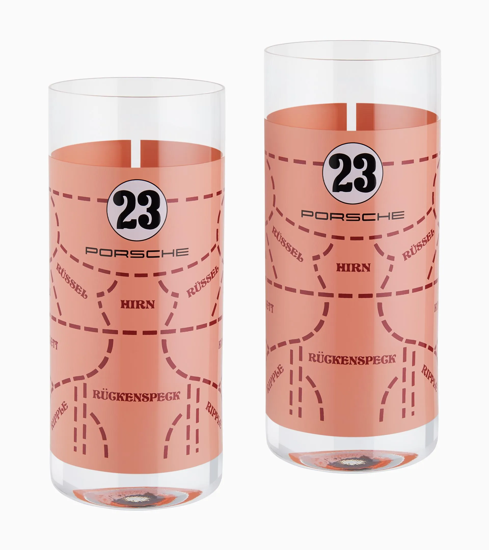 To the icon – cocktails taste twice as good with this set of quality long drink glasses. The design is based on the legendary paintwork of the Porsche 917 "Pink Pig" and was designed by the studio F.A. Porsche.