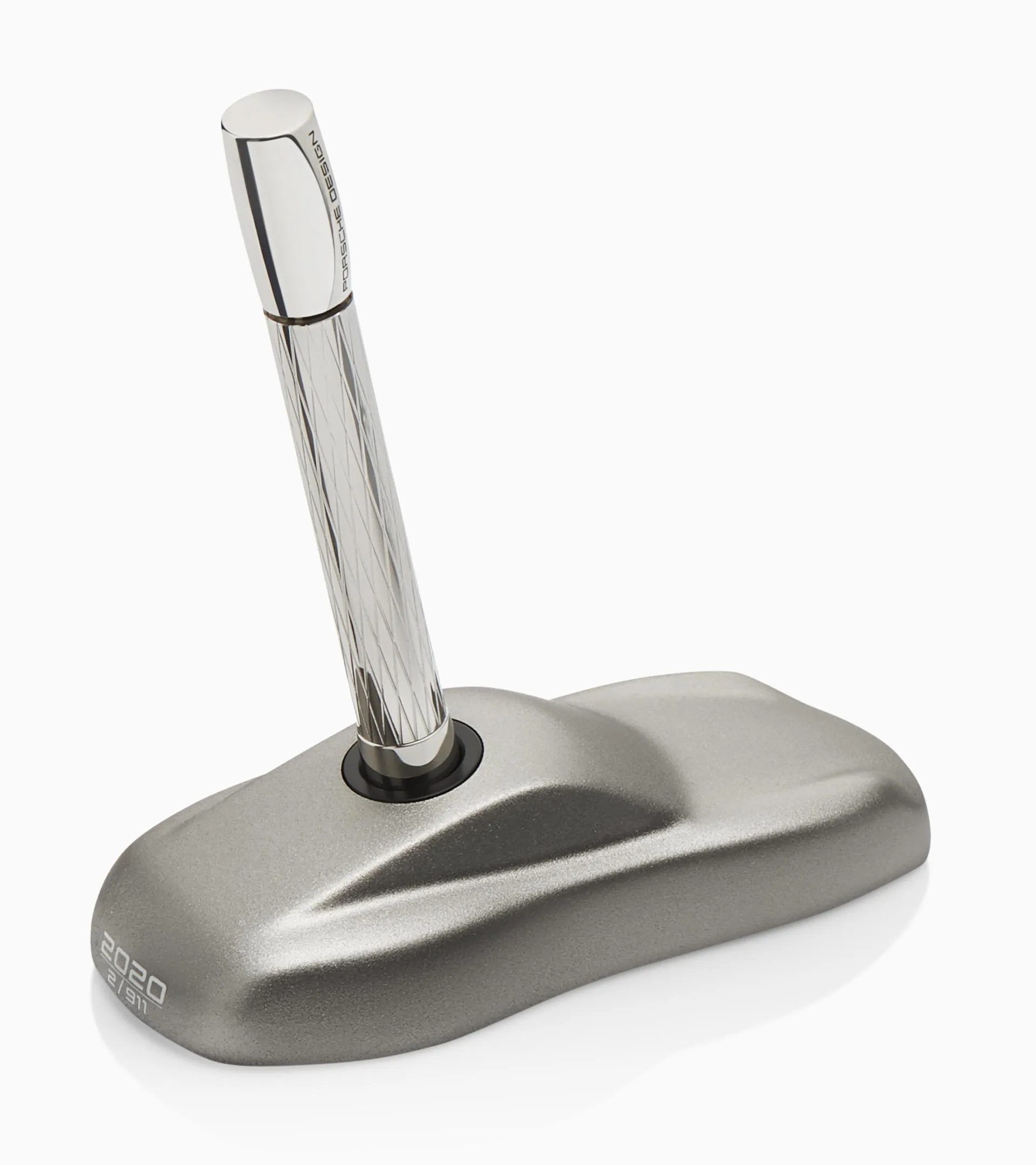 Dynamic form and performance. The limited-edition Porsche Design Shake Pen of the Year 2020 Bundle brings two remarkable icons to your desk: the high-gloss Shake Pen Silver made of stainless steel with diamond-textured patterning and a matching pen holder in the form of a 911 silhouette with a matte ruthenium-colored finish. The Shake Pen features an innovative activation technology: just a quick flip of the wrist and it is ready to write. Shake it again and the refill disappears back into the barrel.