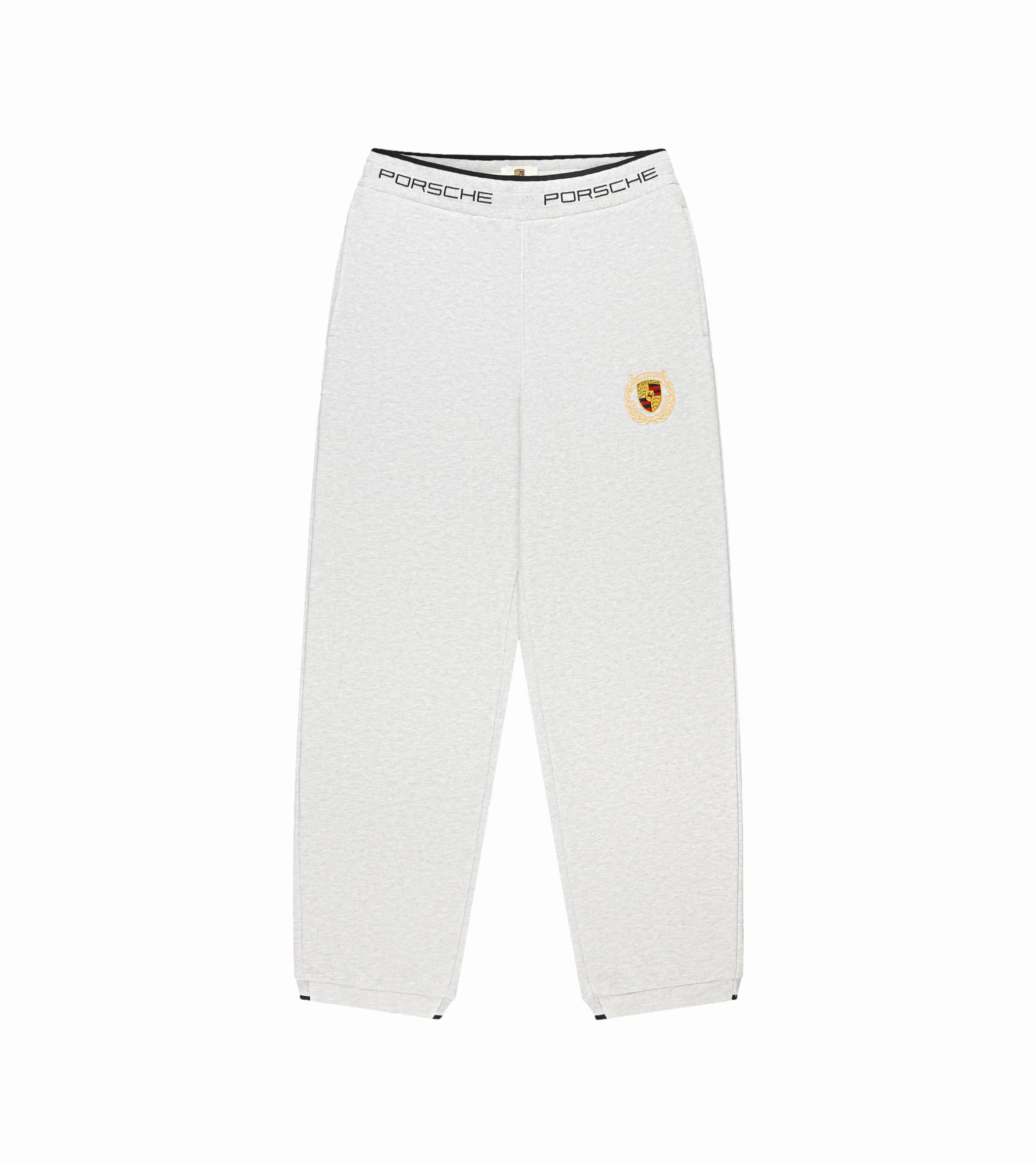 Stylish sweatpants with pockets across front and back and Porsche artwork on left leg.