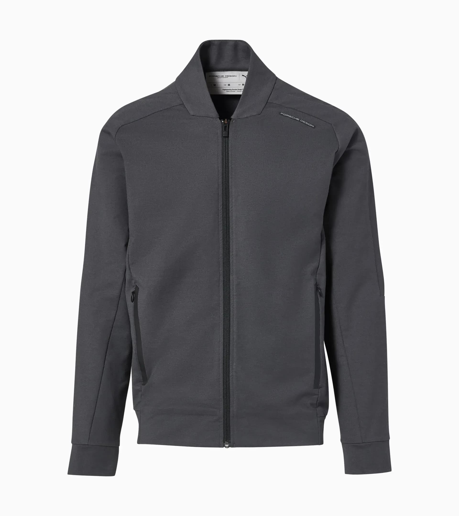 The Porsche Design update to the legendary T7 jacket: the perfect fusion of iconic design and high-tech. The Porsche Design T7 Track Jacket reinterprets classic track apparel, worn by rock stars and athletes since the ’70s, for modern lifestyles. The bold stand collar in a bomber cut, minimalist lines and rubberized pockets with blind zippers all go to show: the proof is in the Details. Exclusive outer shell with 10 % elastane and deep pockets make this jacket a cozy all-rounder – athleisure at its best. Pro tip: wear it as a track combo with the Porsche Design T7 Track Pants.