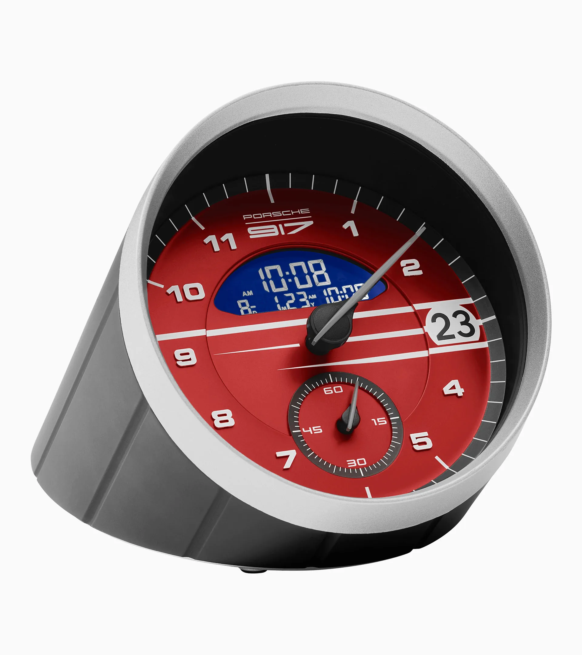 Stylish Porsche table clock in the 917 Salzburg design with LCD display, alarm function and calendar display.