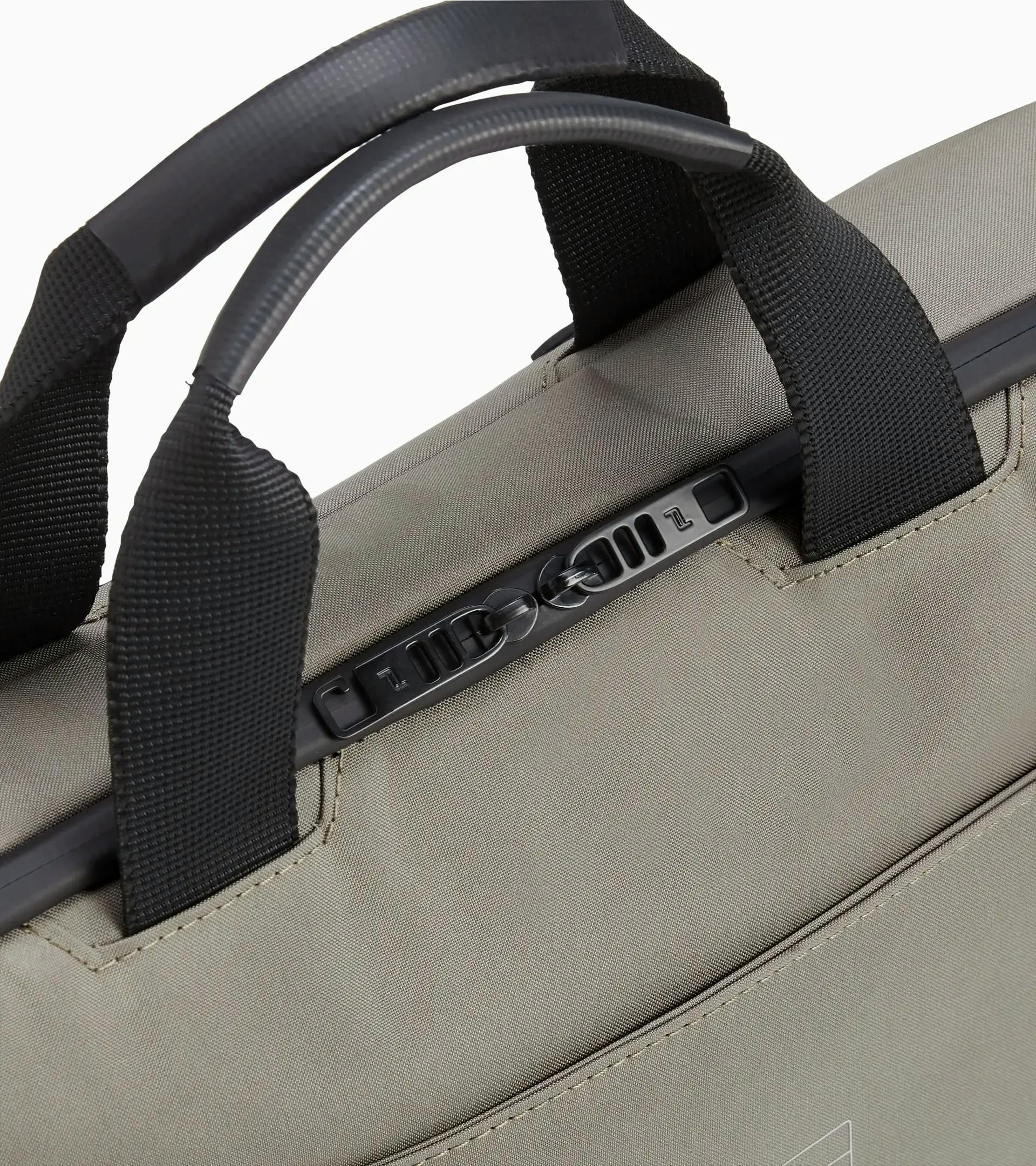 The Porsche Design Urban Eco Collection doesn't really fit into any specific category, but it does fit perfectly into modern everyday life thanks to its style, sustainability, functionality and flexibility. The Porsche Design Urban Eco Briefcase M captivates at first glance with its extraordinary design: the combination of water-repellent polyester and coated, abrasion-resistant fabric gives the briefcase an exciting and sporty look, while the laminated zips, reflective piping on the side pocket and black metal fittings enhance the clean design. Not immediately visible but unmistakably exclusive are the exquisite details such as the PD icon lining with a hexagon pattern and the rear print inspired by Porsche model badges with the coordinates of Zell am See, the home of Studio F.A. Porsche. The equipment is just as smart as the design. The main compartment has a two-way zip and contains a padded section for laptops up to 13" and a slot for tablets, as well as an additional zip pocket and a business organiser. Another zip pocket on the front, trolley link on the back and the adjustable carrying strap with shoulder pad make this bag perfect when travelling for business or leisure.