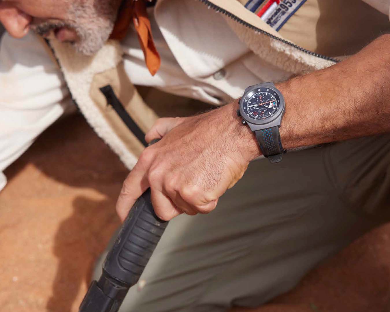 The five-year development period of the new case is similar to that of a new sports car. The result: revolutionary. Thanks to the extreme resistance of the material, even fine sand scratches fall by the wayside. The Chronograph 1 – 911 Dakar will defy the toughest conditions on all of your on- and off-road adventures. Additionally, titanium carbide prevents the visible ageing process and is even lighter than titanium — the extremely low weight ensures that the high wearing comfort lasts until the last stage. The striking Black powder look also gives the chronograph an elegant finish, while the abbreviation TiC for titanium carbide on the dial evokes memories of the famous Porsche Design "Military" watches made of stainless steel with the abbreviation 3H for the tritium luminous material of the time.