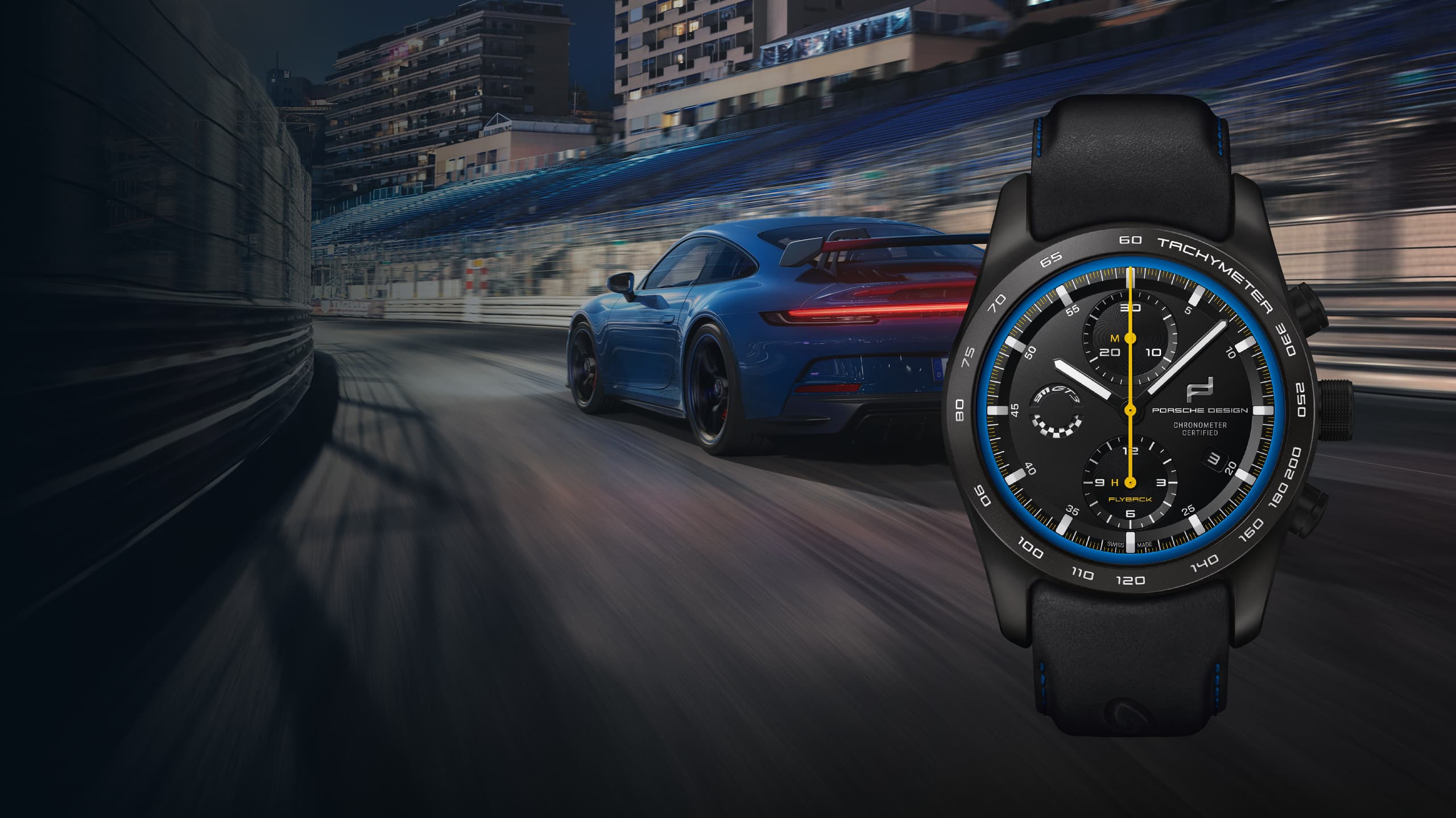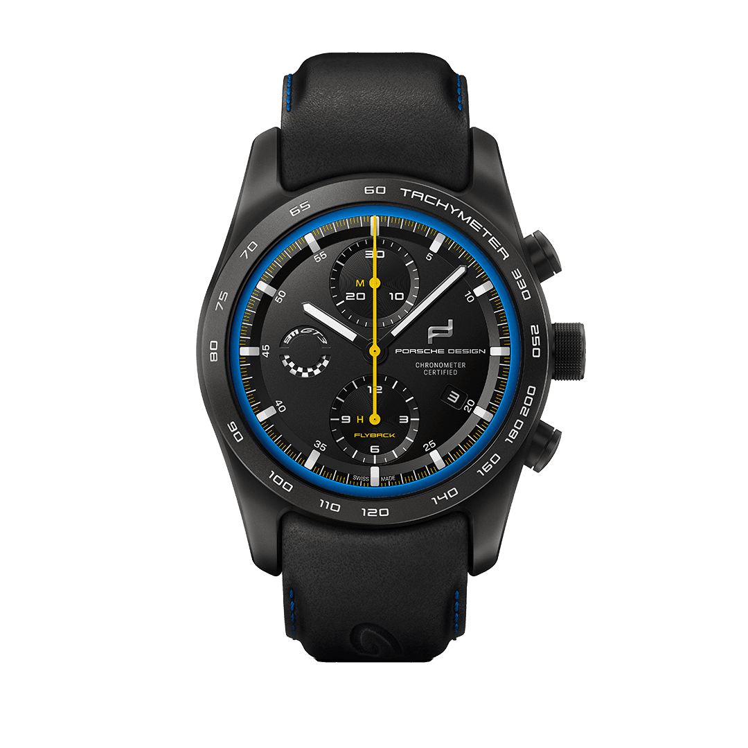 The strong connection between the Chronograph 911 GT3 and the Porsche 911 GT3 is immediately obvious: a variety of design features and materials from the legendary sports car can also be found on the timepiece. The watch is available in two different versions: a sports version with applied dial color ring in eye-catching Shark Blue or a classic version with a traditional black color ring.